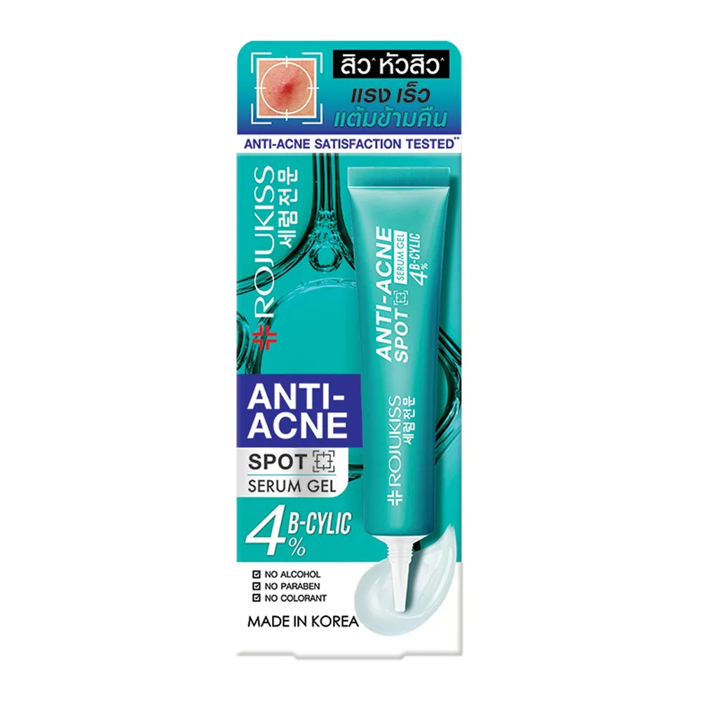 โรจูคิส แอนติ-แอคเน่ สปอต เซรั่ม เจล เซรั่มเจลพิเศษเข้มข้น เพื่อฟื้นบำรุงผิว ถึงระดับเซลล์ชั้นลึก อุดมด้วยบีไซลิก 4% เอกสิทธิ์เฉพาะของ ROJUKISS และ Bija Extract (สารสกัดจากลูกจันทน์เกาหลี) สามารถจัดการสิวอย่างต่อเนื่องและออกฤทธิ์ได้ยาวนานเต็มประสิทธิภาพแต่อ่อนโยนต่อผิว พร้อมทั้งลดการสะสมของแบคทีเรีย ควบคุมความมัน ลดการอุดตัน ผลัดเซลล์ผิว ลดโอกาสการเกิดรอยจากสิว ลดเลือนรอยดำรอยแดงจากสิวเก่า และบำรุงผิวให้ดูแข็งแรงขึ้น<br />