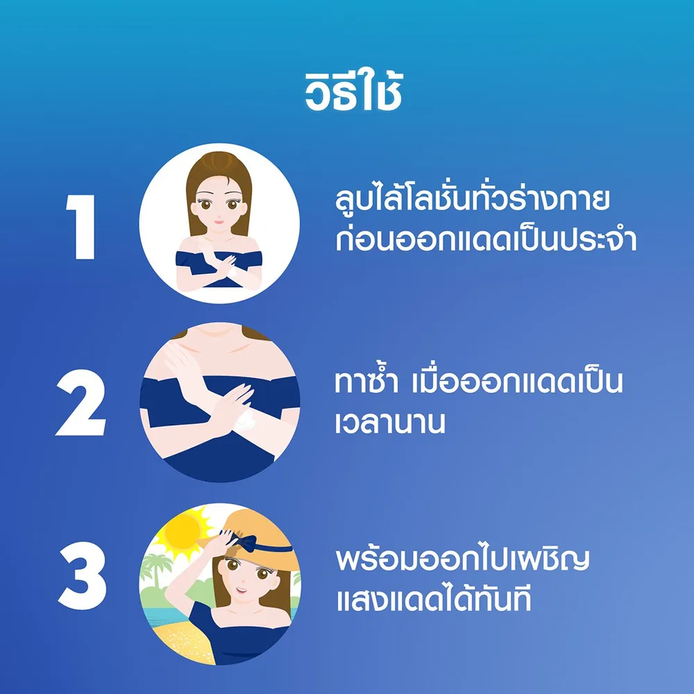 โลชั่นป้องกันแสงแดดสำหรับผิวกาย เพื่อผิวนุ่มชุ่มชื่น ลดปัญหาผิวคล้ำเสียจากแสงแดด ชะลอการเกิดริ้วรอยก่อนวัย สีผิวดูสม่ำเสมอ ผิวเนียนนุ่มชุ่มชื้น ดูอ่อนเยาว์ ไม่เหนียวเหนอะหนะ<br />