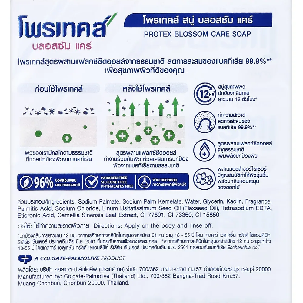 โพรเทคส์ บลอสซัมแคร์ สูตรผสานแฟลกซ์ซีด ออยล์ ทำงานร่วมกับผิว ช่วยเสริมการปกป้องผิวจากแบคทีเรียตามธรรมชาติ ลดการสะสมของแบคทีเรีย 99.9% มีส่วนผสมมอยส์เจอร์ไรเซอร์ พร้อมกลิ่นหอมของดอกไม้ ผ่านการทดสอบโดยแพทย์ผิวหนัง<br />