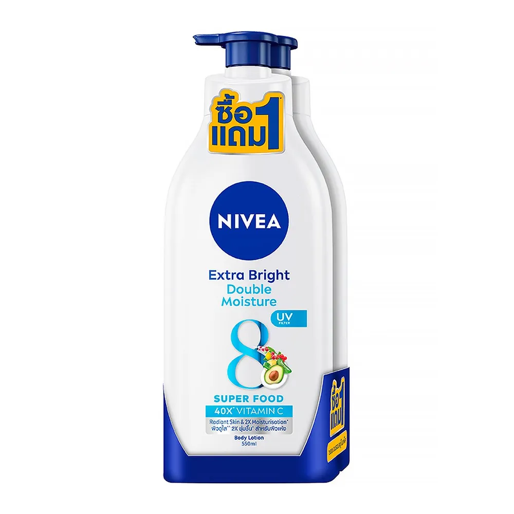 นีเวีย เอ็กซ์ตร้า ไบรท์ ดับเบิ้ล มอยส์เจอร์ บอดี้ โลชั่น ผลิตภัณฑ์บำรุงผิวกาย เนื้อบางเบา ไม่เหนียวเหนอะหนะ อุดมไปด้วยคุณค่าของวิตามินซีสูง 40 เท่า* จาก 8 สุดยอดอาหารผิว พร้อมวิตามินอีให้ผิวดูกระจ่างใส^^ ชุ่มชื้น 40X* วิตามินซี จาก 8 สุดยอดอาหารผิว อโลเวร่า แตงกวา อะเซโรล่าเชอร์รี่ คามูคามู ส้ม อะโวคาโด ชาเขียว เลม่อน วิตามินอี ช่วยบำรุงผิวให้ชุ่มชื้น ยูวีฟิลเตอร์<br />