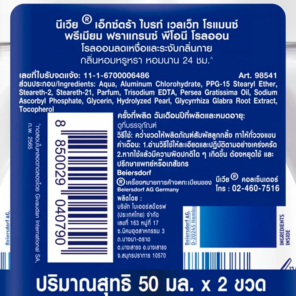 นีเวีย เอ็กซ์ตร้า ไบรท์ พรีเมียม ฟราแกรนซ์ เวลเว็ท โรแมนซ์ พีโอนี โรลออน 50 มล. แพ็ค 2