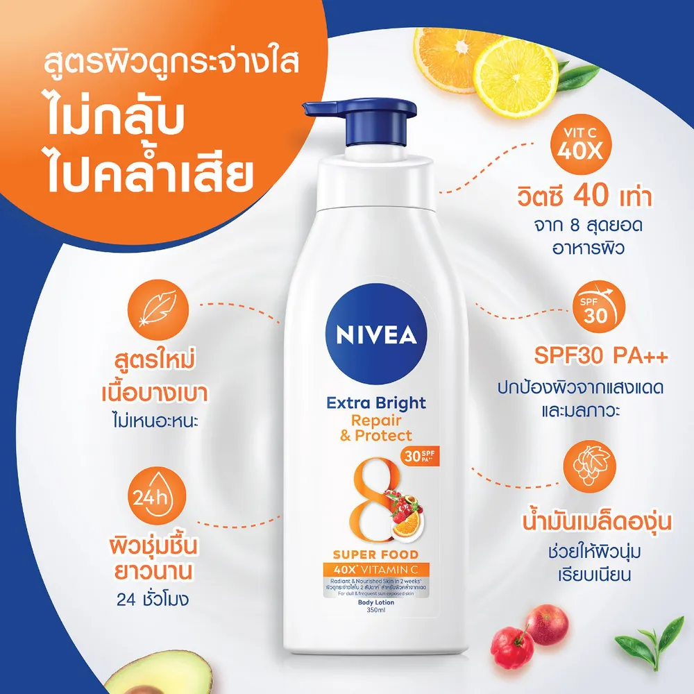 นีเวีย เอ็กซ์ตร้า ไบรท์ รีแพร์ แอนด์ โพรเทค โลชั่นเข้มข้นเนื้อบางเบา เปี่ยมประสิทธิภาพ แตกต่างด้วยเทคโนโลยี 50X* วิตามินซีจาก 8 สุดยอดอาหารผิว แตงโม พีช อะเซโรล่าเชอร์รี่ คามูคามู ส้ม อะโวคาโด ชาเขียว เลม่อน ผสานสารป้องกันแสงแดด SPF30 ไม่เพียงเข้าฟื้นบำรุงผิวคล้ำเสียสะสมได้ลึกถึงเซลล์ผิว แต่ยังช่วยปกป้องผิวจากการทำร้ายของแสงแดด ไม่ให้ผิวกลับไปคล้ำเสียอีก<br />