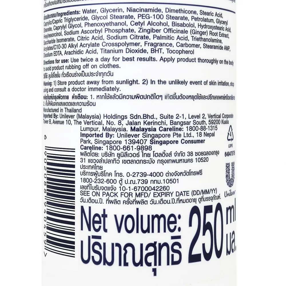 - วาสลีน โปร เดอร์มา ไนอาซินาไมด์ ไบร์ทเทนนิ่ง บอดี้ โลชั่น<br />