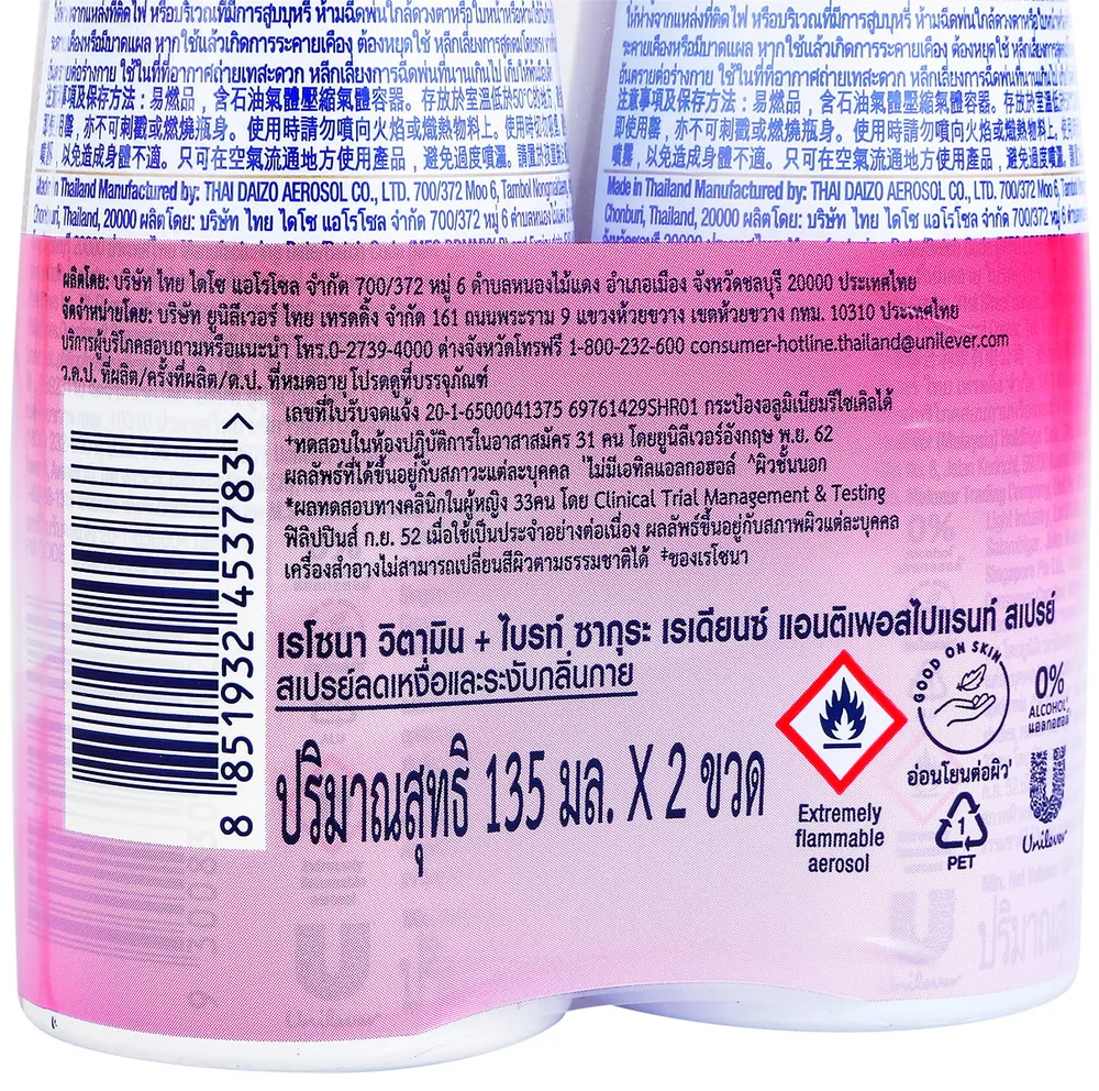 เรโซนา สเปร์ย วิตามิน + ไบรท์ ซากุระ เรเดียนซ์ แอนติเพอสไปแรนท์ สเปรย์ลดเหงื่อและระงับกลิ่นกาย ปกป้องยาวนาน 72 ชม. ผสานพลังแอนติออกซิแดนท์ คอมเพล็กซ์ จากวิตามินบี 3 ซี และ อี ที่ซึมลึกสู่ภายใน พร้อมเสริมเกราะผิวใต้วงแขน<br />