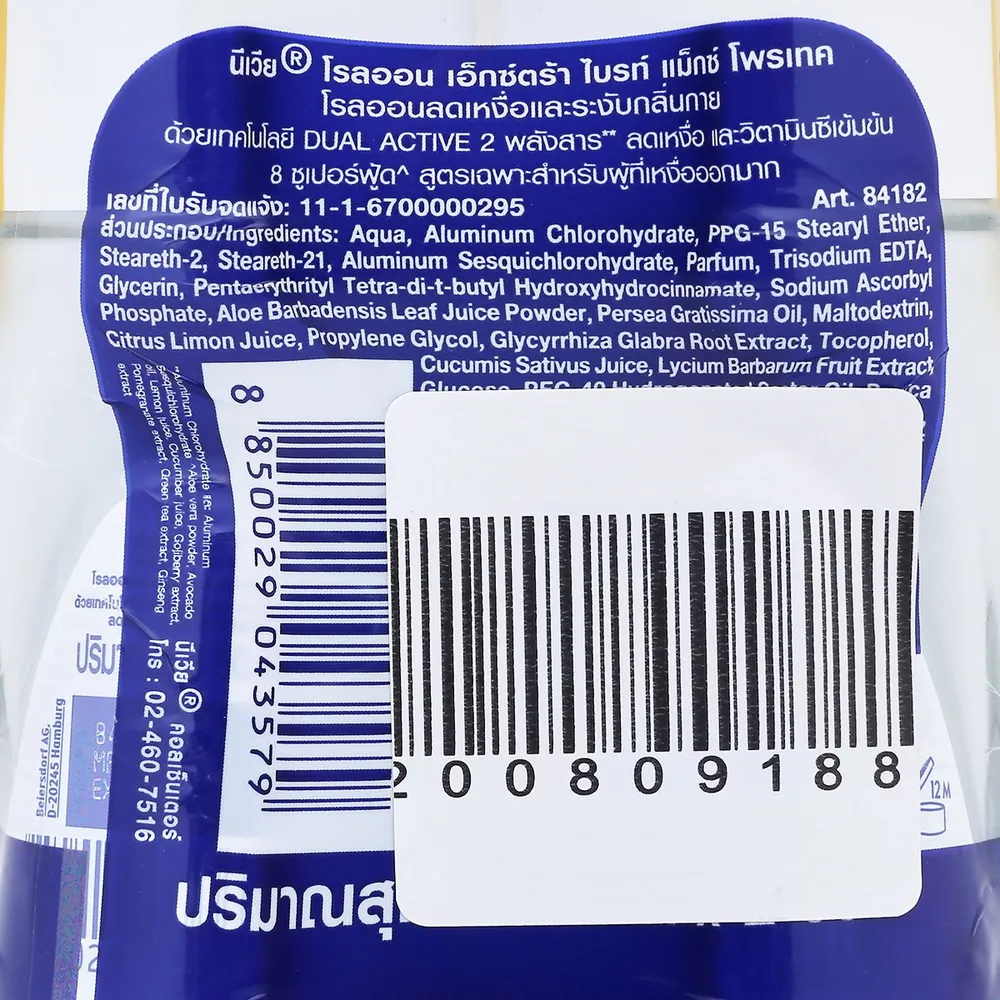 นีเวีย เอ็กซ์ตร้า ไบรท์เทนนิ่ง แม็กซ์ โพรเทค โรลออน ด้วยเทคโนโลยี DUAL ACTIVE 2 พลังสารลดเหงื่อ และวิตามินซีเข้มข้น 8 ซูเปอร์ฟู้ด* สูตรเฉพาะสำหรับผู้ที่เหงื่อออกมาก ช่วยลดเหงื่อและกลิ่นกาย พร้อมฟื้นบำรุงผิวคล้ำเสียให้ดูกระจ่างใส รู้สึกแห้งสบาย ยาวนาน 48ชม.** พิสูจน์แล้วโดยผู้เชี่ยวชาญ พร้อมกลิ่นหอมสดชื่นตลอดวัน 0% แอลกอฮอล์^<br />