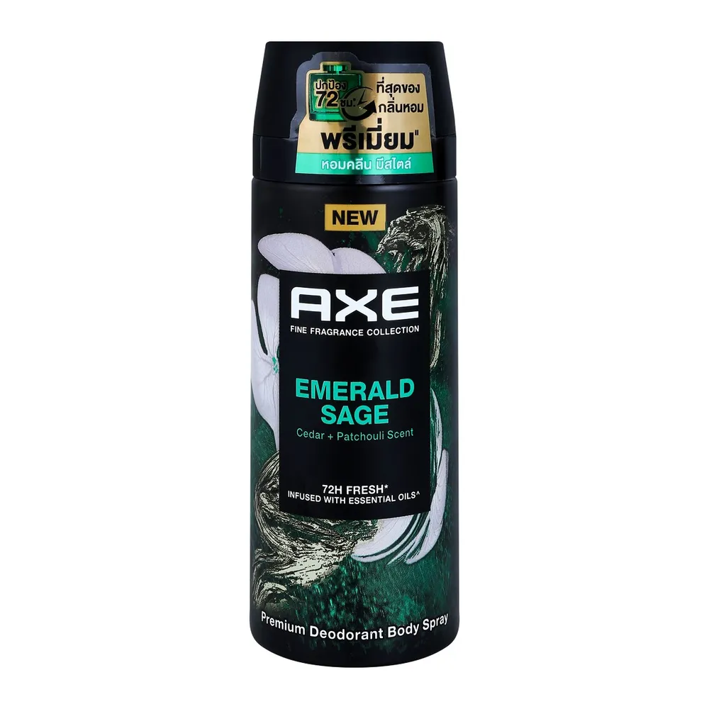 แอ๊กซ์ สเปรย์น้ำหอมระงับกลิ่นกาย กลิ่นเอมเมอรัลด์ เซจ ที่สุดของกลิ่นหอมพรีเมี่ยม&rdquo; คิดค้นโดยบริษัทน้ำหอมระดับโลก หอมคลีน มีสไตล์ ผสานเอสเซนเชี่ยล ออยล์จากซีดาร์และแพทชูลี่ พร้อมปกป้องกลิ่นกาย 72 ชม.* ด้วย Zinc Complex Technology 2เท่า<br />