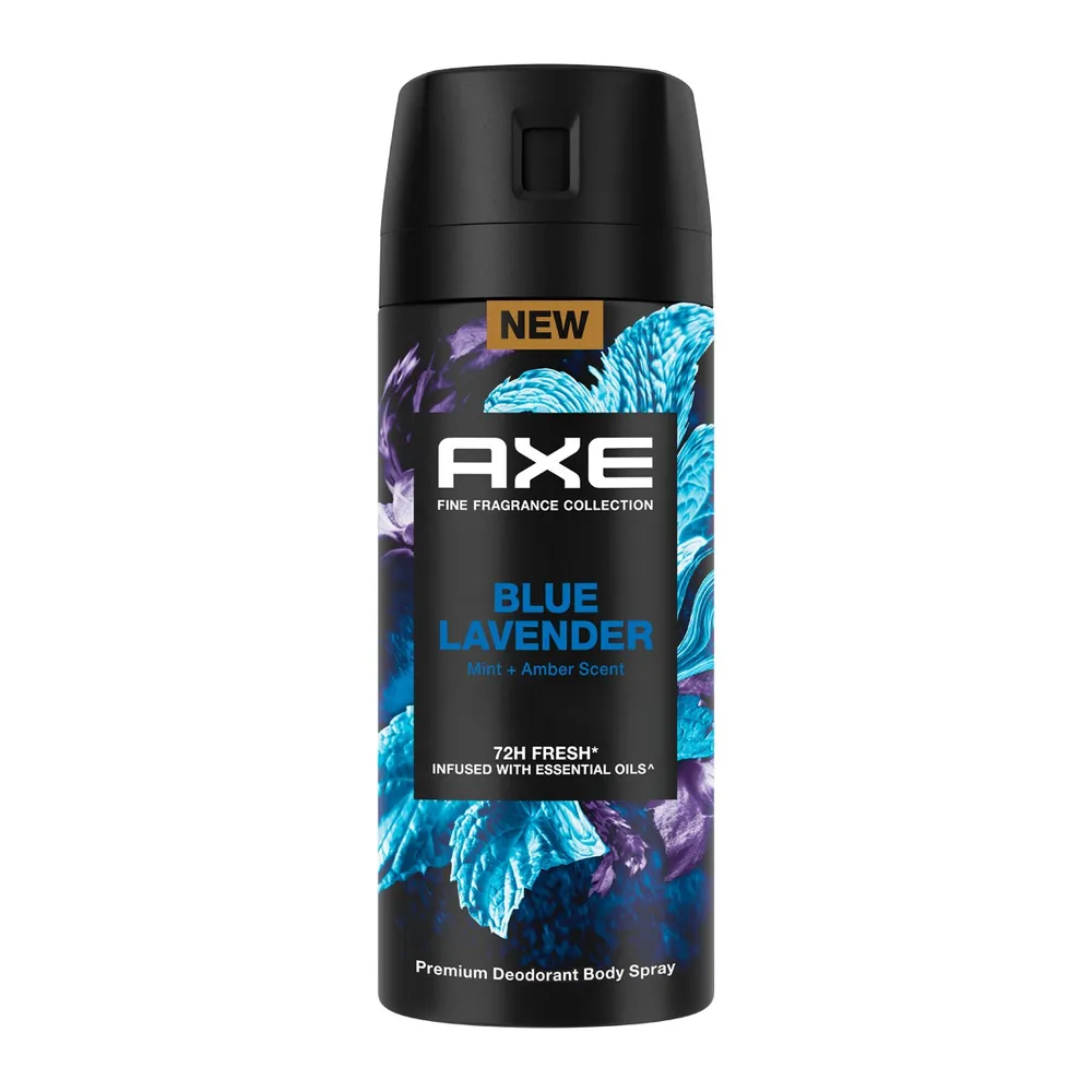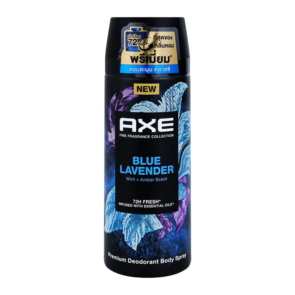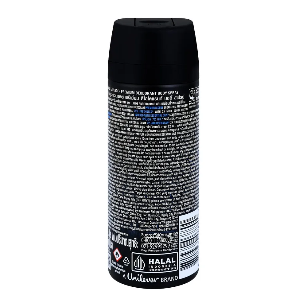 แอ๊กซ์ สเปรย์น้ำหอมระงับกลิ่นกาย กลิ่นบลูลาเวนเดอร์ ที่สุดของกลิ่นหอมพรีเมี่ยม คิดค้นโดยบริษัทน้ำหอมระดับโลก หอมละมุน คลาสซี่ ผสานเอสเซนเชี่ยล ออยล์จากมินท์และแอมเบอร์ พร้อมปกป้องกลิ่นกาย 72 ชม.* ด้วย Zinc Complex Technology 2 เท่า<br />