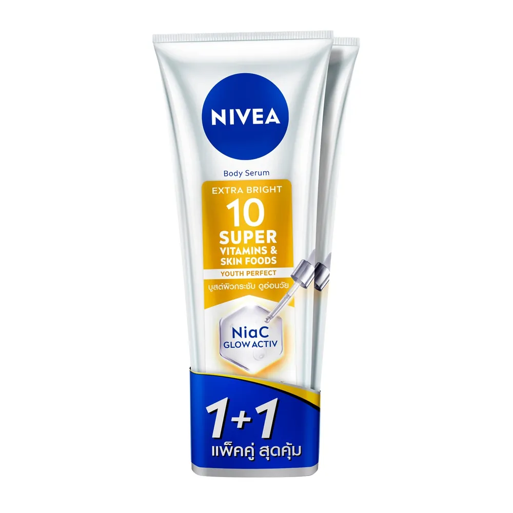 นีเวีย บอดี้ เซรั่ม เอ็กซ์ตร้า ไบรท์ 10 ซูเปอร์ วิตามิน แอนด์ สกิน ฟู้ด ยูธ เพอร์เฟค เซรั่มบำรุงผิวกาย เนื้อบางเบา บูสต์ผิวกระชับ อิ่มฟู ดูอ่อนวัยใน 5 วัน 1 ไนอาซี แอ็กทีฟ ผสาน 2 พลังไบรท์เทนนิ่ง ไนอาซินาไมด์ + วิตามินซี ซึมลึก เข้าบำรุงหลายชั้นผิว เพื่อผิวดูอ่อนวัย 5 มิติ**<br />