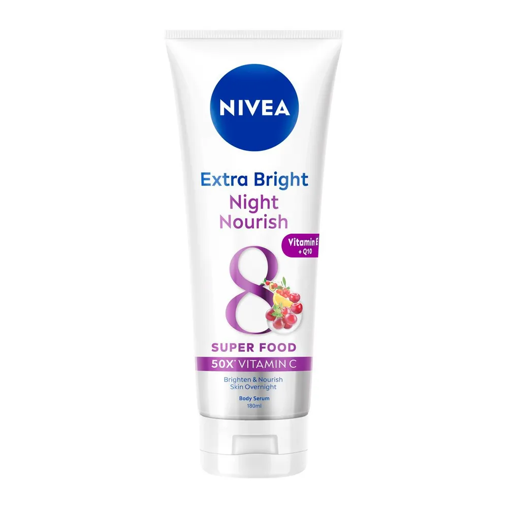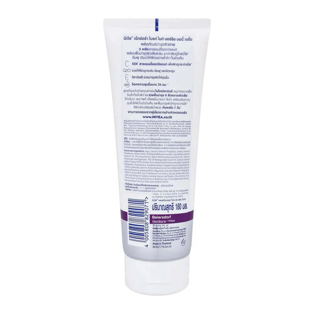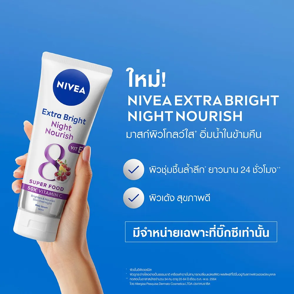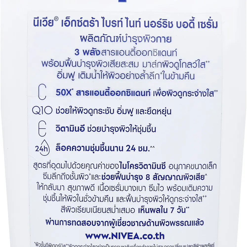 นีเวีย เอ็กซ์ตร้า ไบรท์ ไนท์ นอร์ริช บอดี้ เซรั่ม ผลิตภัณฑ์บำรุงผิวกาย 3 พลัง สารแอนตี้ออกซิแดนท์ พร้อมฟื้นบำรุงจากผิวเสียสะสม มาส์กผิวดูโกลว์ใส++อิ่มฟู เติมน้ำให้ผิวอย่างล้ำลึก+ในข้ามคืน<br />