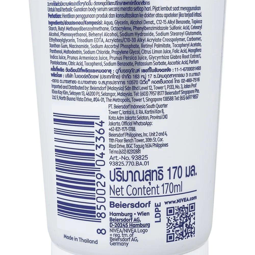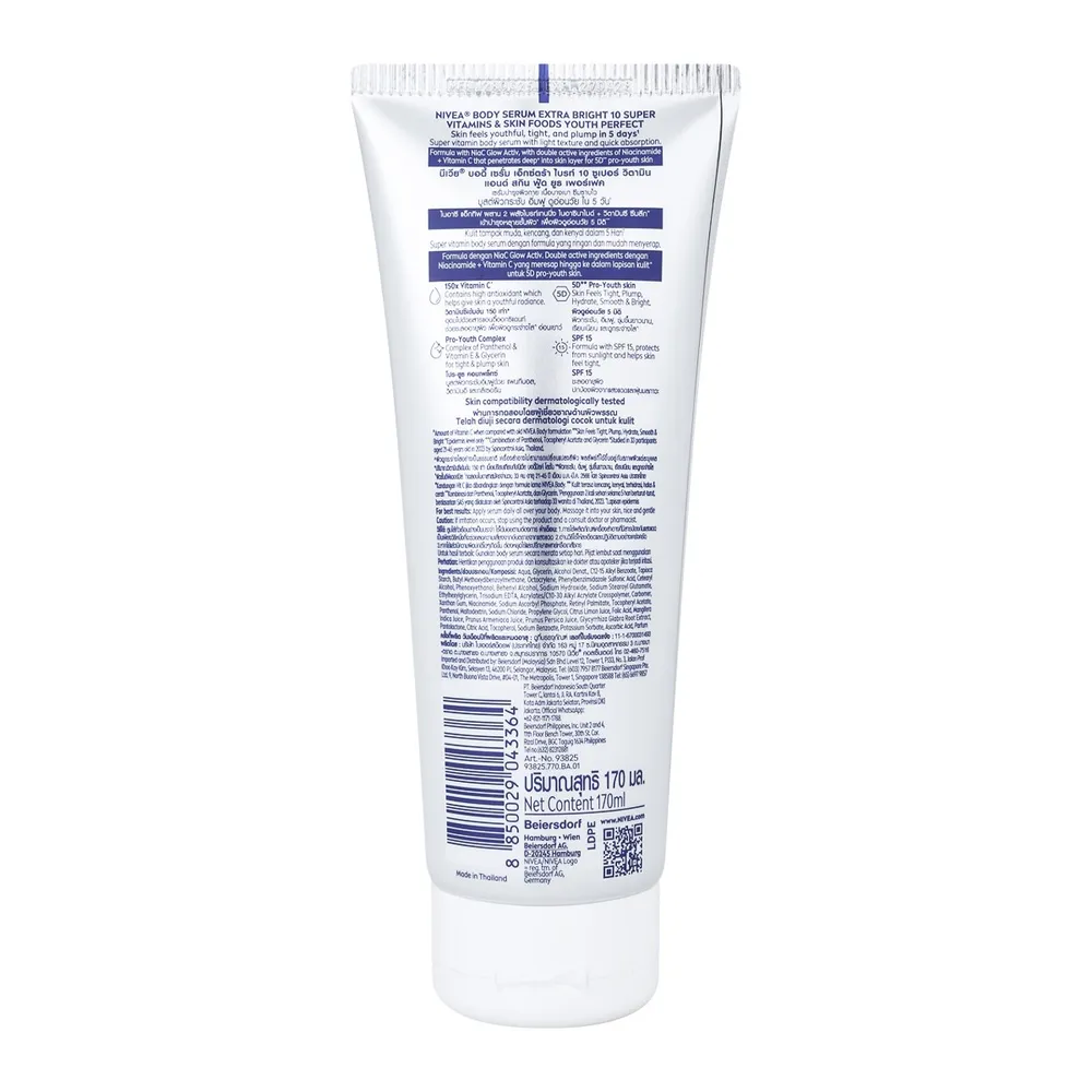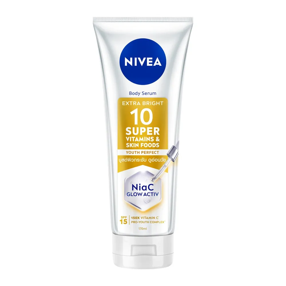 นีเวีย บอดี้ เซรั่ม เอ็กซ์ตร้า ไบรท์ 10 ซูเปอร์ วิตามิน แอนด์ สกิน ฟู้ด ยูธ เพอร์เฟค เซรั่มบำรุงผิวกาย เนื้อบางเบา บูสต์ผิวกระชับ อิ่มฟู ดูอ่อนวัย ใน 5 วัน1 ไนอาซี แอ็กทีฟ ผสาน 2 พลังไบรท์เทนนิ่ง ไนอาซินาไมด์ + วิตามินซี ซึมลึก+ เข้าบำรุงหลายชั้นผิว+ เพื่อผิวดูอ่อนวัย 5 มิติ<br />