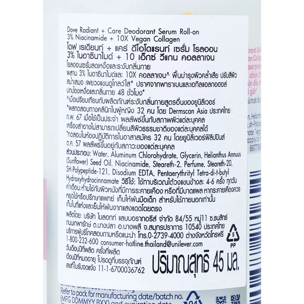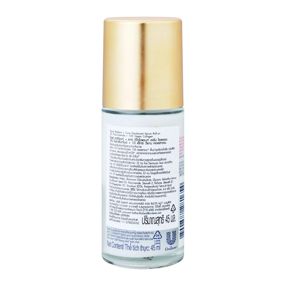 โดฟ เรเดียนท์ + แคร์ ดีโอโดแรนท์ เซรั่ม โรลออน 3% ไนอาซินาไมด์ + 10 เอ็กซ์ วีแกน คอลลาเจน 45 มล.