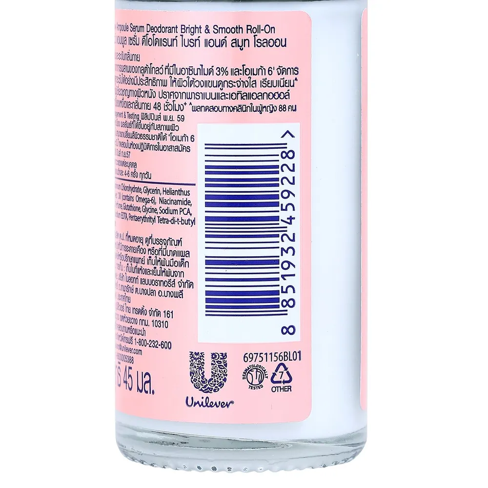 วาสลีน โรลออน เซรั่ม กลูต้าโกลว์ แอมพูล 3% ไนอาซินาไมด์ สูตร ไบรท์ &amp; สมูท ผลิตภัณฑ์ลดเหงื่อและระงับกลิ่นกาย ผสานแอมพูลเซรั่มเข้มข้น กลูต้าโกลว์ และไนอาซินาไมด์ 3% ช่วยลดเลือนความหมองคล้ำ พร้อมปรับสีผิวให้สม่ำเสมอ ผิวใต้วงแขนดูโกลว์ใสออร่า<br />