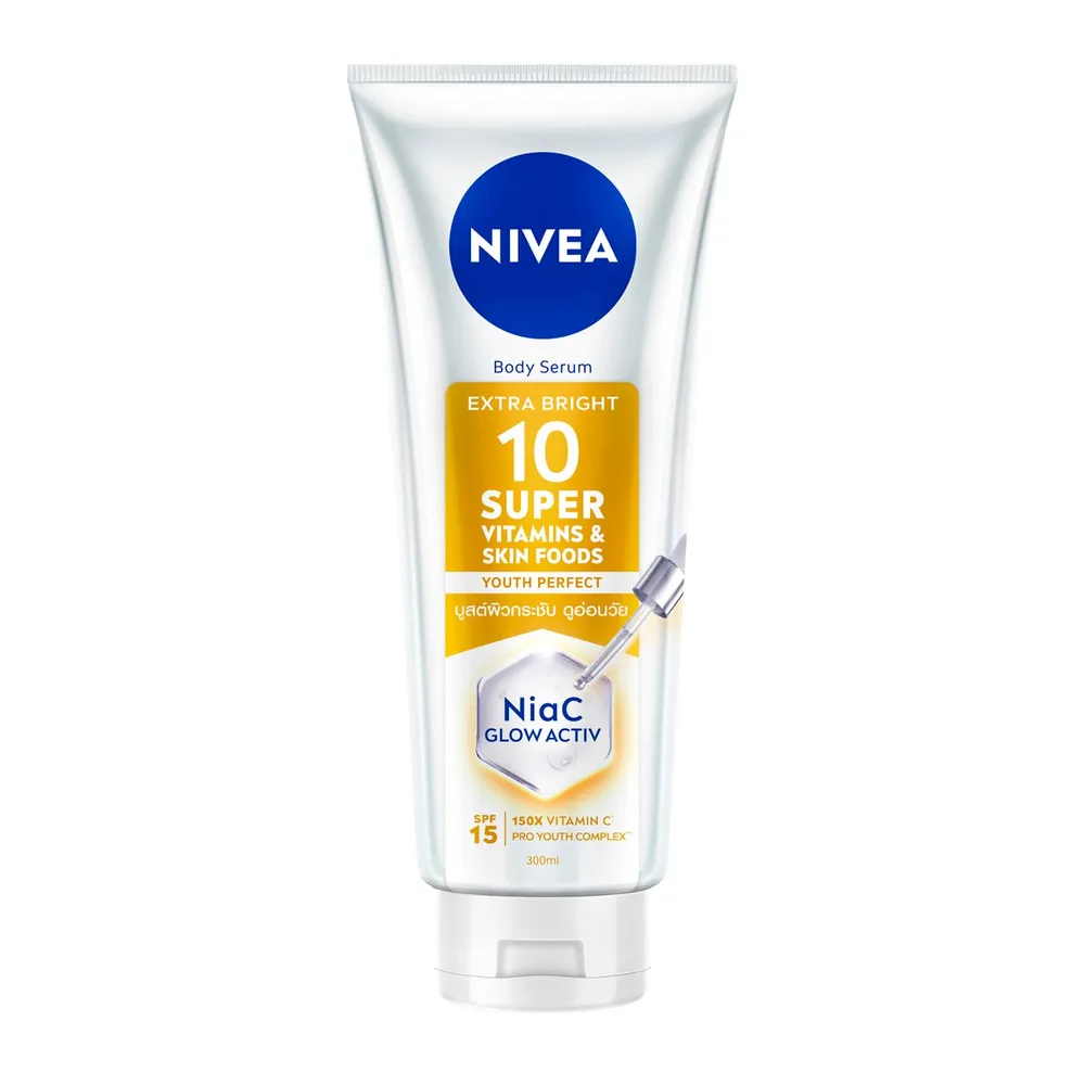 นีเวีย บอดี้ เซรั่ม เอ็กซ์ตร้า ไบรท์ 10 ซูเปอร์ วิตามิน แอนด์ สกิน ฟู้ด ยูธ เพอร์เฟค เซรั่มบำรุงผิวกาย เนื้อบางเบา บูสต์ผิวกระชับ อิ่มฟู ดูอ่อนวัย ใน 5 วัน1 ไนอาซี แอ็กทีฟ ผสาน 2 พลังไบรท์เทนนิ่ง ไนอาซินาไมด์ + วิตามินซี ซึมลึก เข้าบำรุงหลายชั้นผิว เพื่อผิวดูอ่อนวัย 5 มิติ**<br />