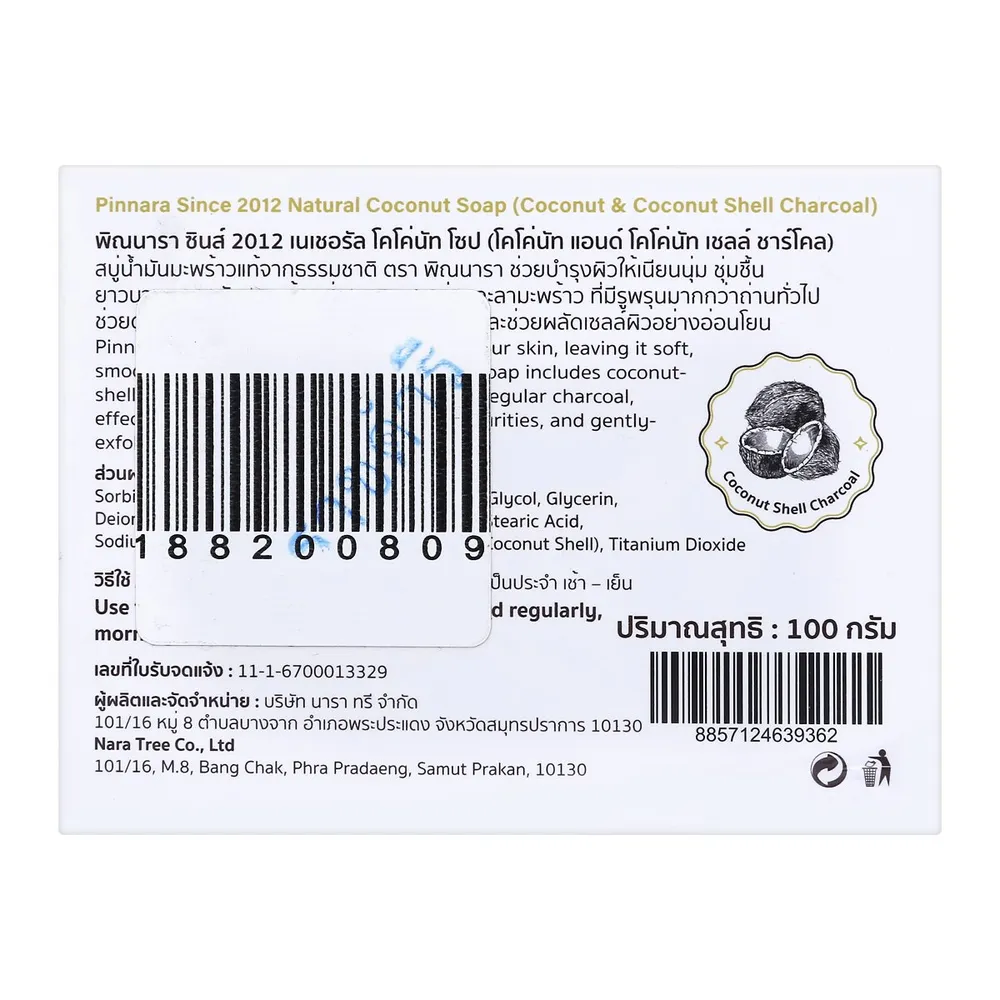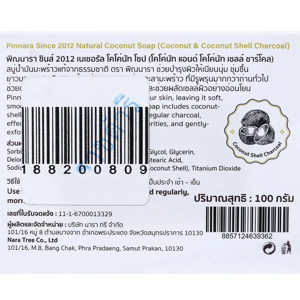 พิณนารา สบู่มะพร้าวถ่าน ผสานส่วนผสมจากธรรมชาติที่มีประโยชน์ต่อผิว ช่วยชำระล้างผิวของคุณให้สะอาดหมดจดอย่างล้ำลึก<br />