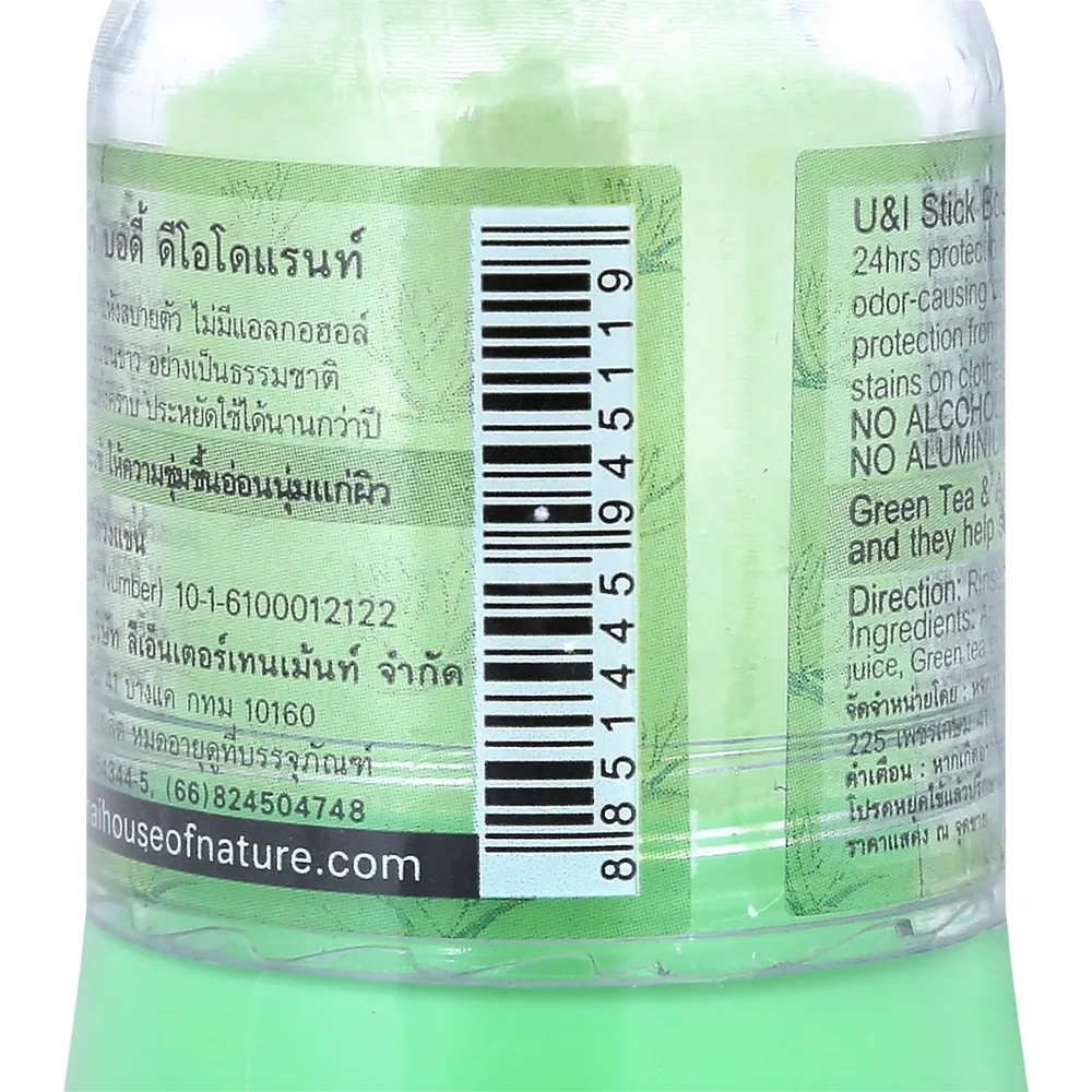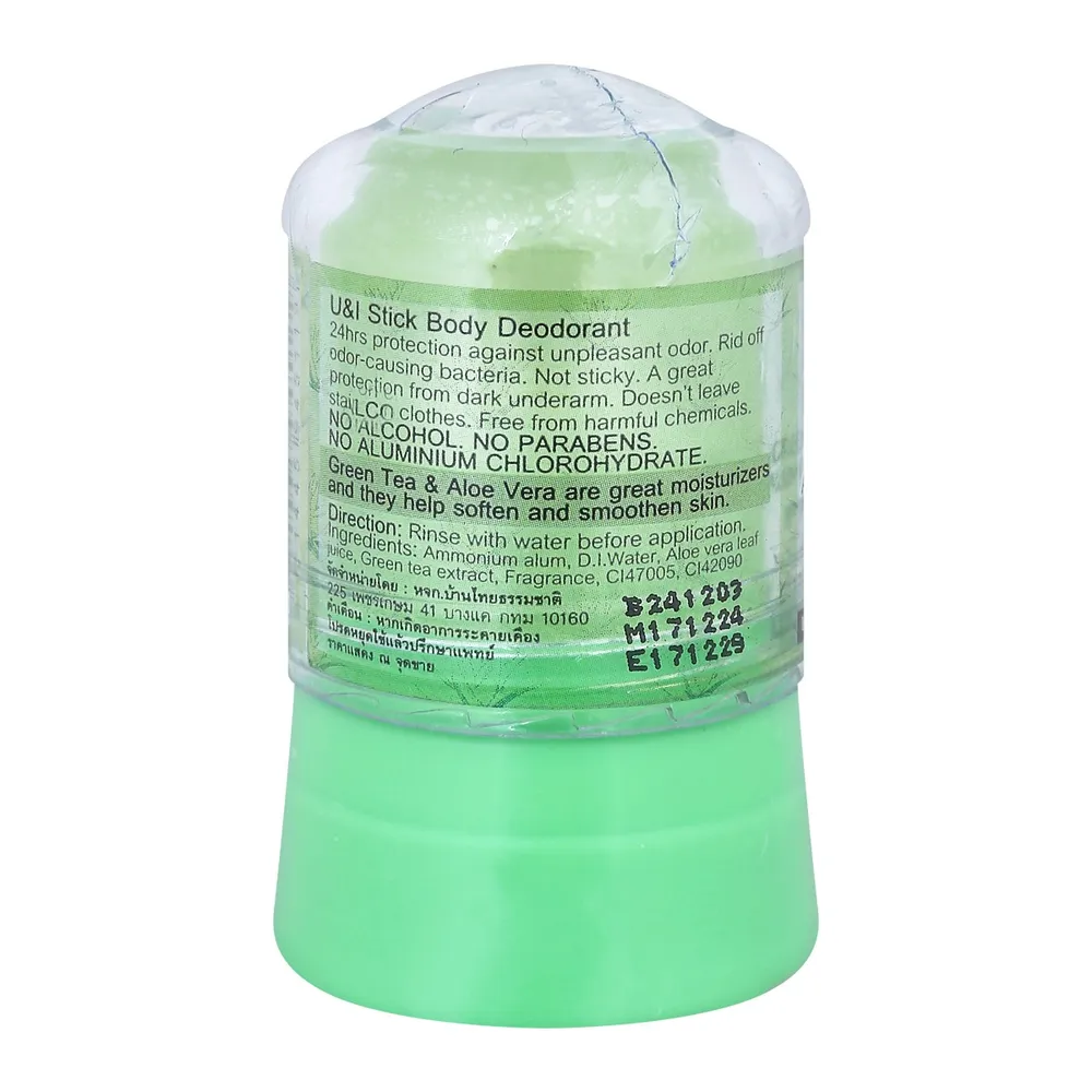 ยูแอนด์ไอ สติ๊ก บอดี้ ดีโอโดแรนท์ สารส้มระงับกลิ่นกาย สูตรชาเขียว ว่านหางจระเข้ มั่นใจตลอด 24 ชั่วโมง แห้ง สบายตัว วงแขนขาวอย่างเป็นธรรมชาติ ไม่เหนียวเหนอะหนะ ไม่ทิ้งคราบ ประหยัดใช้ได้นานกว่าปี<br />