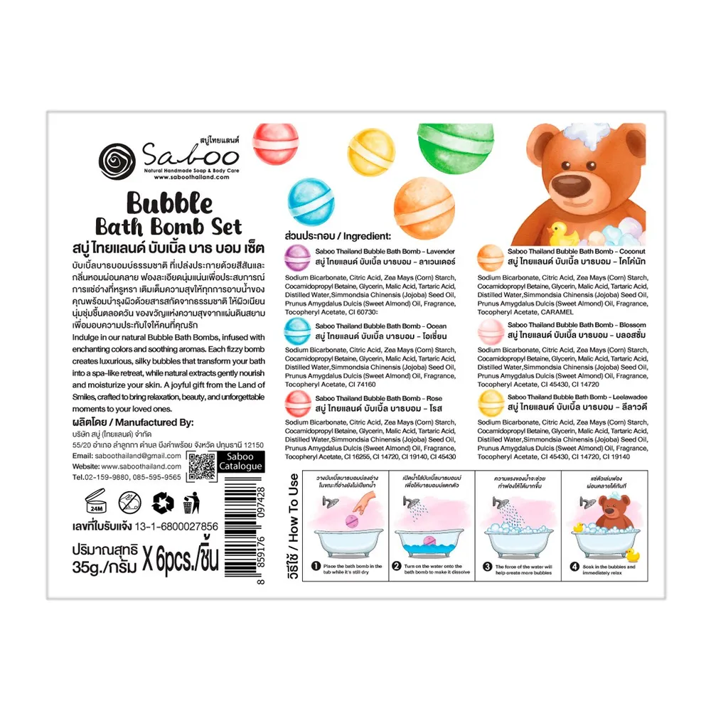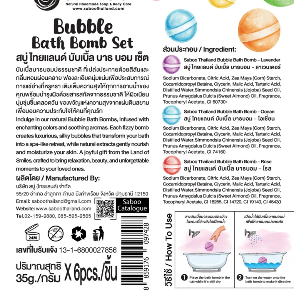 <p>สบู่ ไทยแลนด์ บับเบิ้ล บาธ บอม เซต<br /> <br /> เติมเต็มความสุขให้ทุกการอาบน้ำของคุณพร้อมบำรุงผิวด้วยสารสกัดจากธรรมชาติ<br /> <br /> - ผลิตภัณฑ์บาธบอมแช่ตัว<br /> - ฟองละเอียดนุ่มแน่น<br /> - เพิ่มฟองในอ่างอาบน้ำ Jacuzzi สระเป่าลม<br /> - เพิ่มระดับการผ่อนคลาย และสนุกมากยิ่งขึ้น<br /> - เพิ่มแรงจูงใจในการอาบน้ำของเด็ก ๆ ให้สนุกสนานเพลิดเพลิน สร้างกิจกรรมความสัมพันธ์อันดีในครอบครัว<br /> <br /> <span style="color: #ff0000;">*บริษัทฯ ขอสงวนสิทธิ์ในการปรับเปลี่ยนราคาจำหน่ายและโปรโมชั่น รวมถึงแพ็คเกจและปริมาณสินค้าจากผู้ผลิตได้ตามความเหมาะสม โดยไม่จำเป็นต้องแจ้งให้ทราบล่วงหน้า</span><br /> <br /> *สีของสินค้าอาจมีความแตกต่าง ขึ้นอยู่กับการตั้งค่าของแต่ละหน้าจอ และภาพประกอบใช้เพื่อการโฆษณาเท่านั้น</p>