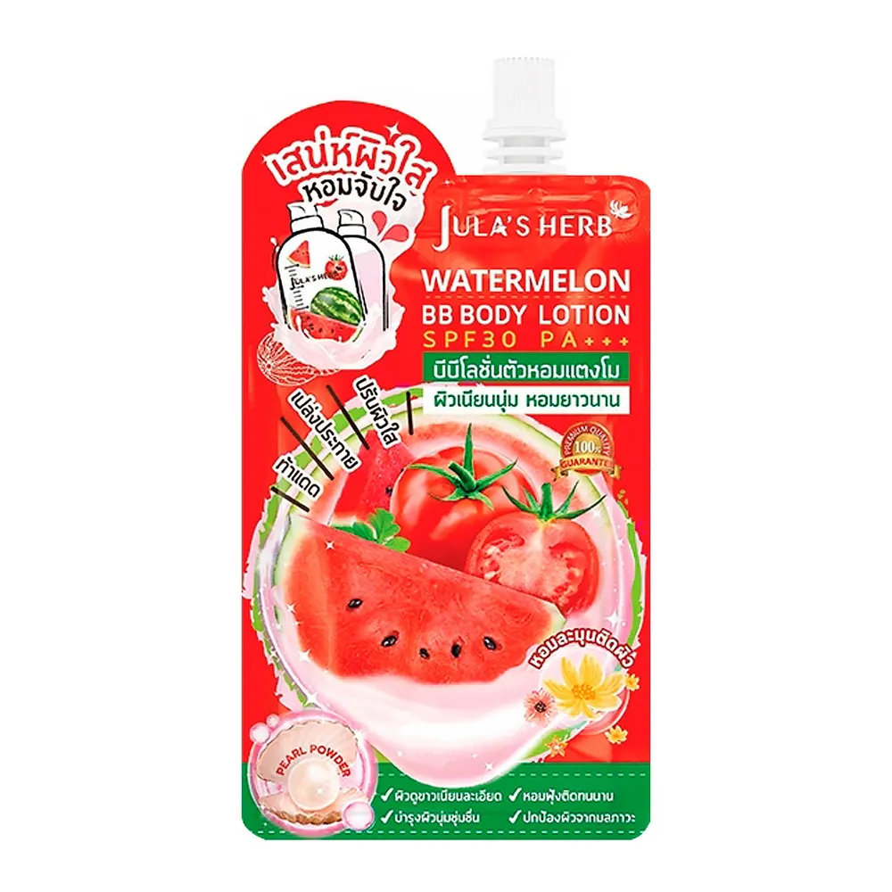 จุฬาเฮิร์บ บีบีโลชั่นตัวขาวแตงโม นวัตกรรมใหม่ของโลชั่นเนื้อบางเบาในรูปแบบซอง ที่ผสมสารสกัดเข้มข้นจากแตงโม มะเขือเทศ และกลูต้าไธโอน ช่วยปรับสีผิวให้กระจ่างใส เรียบเนียนสม่ำเสมอ ช่วยปกป้องและฟื้นบำรุงผิวคล้ำเสียจากแสงแดด รังสี UVA และ UVB ด้วยค่า SPF30 PA+++<br />