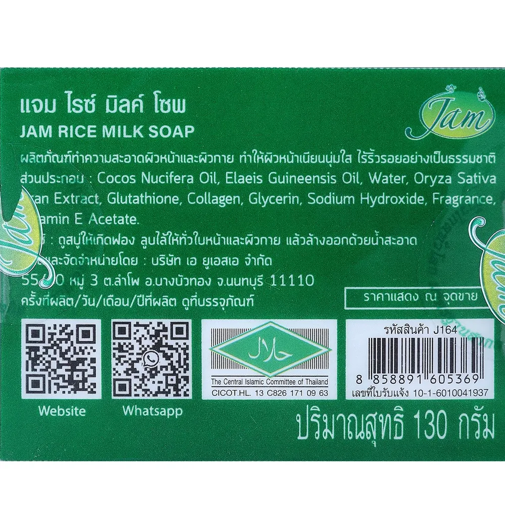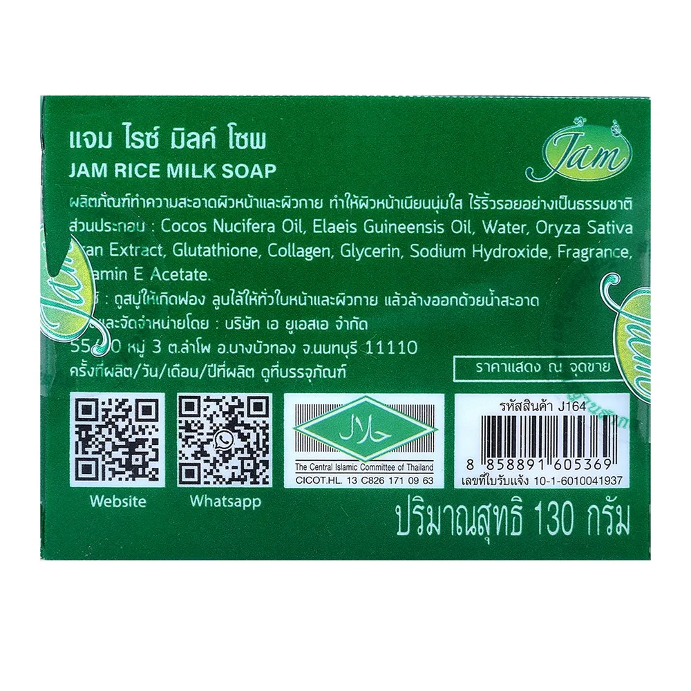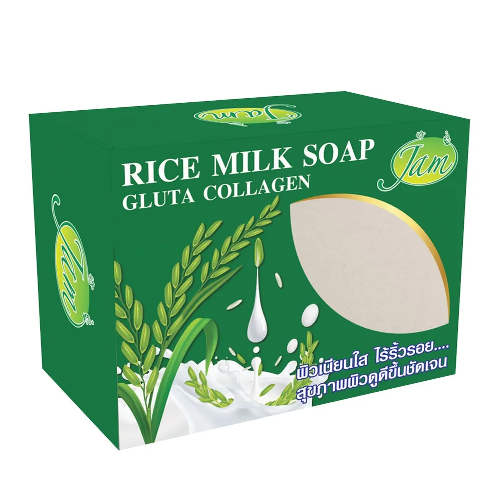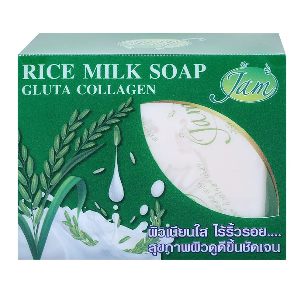 แจม สบู่ไรซ์มิลค์ กลูต้า คอลลาเจน ผลิตภัณฑ์ที่มีส่วนผสมของน้ำนมข้าวหอมมะลิ กลูต้า และคอลลาเจน ช่วยดูแลผิวหน้าและผิวกาย ทำให้ผิวเนียน นุ่ม ใส เป็นธรรมชาติ สิว ฝ้า กระ จุดด่างดำ ค่อยๆจางลง<br />