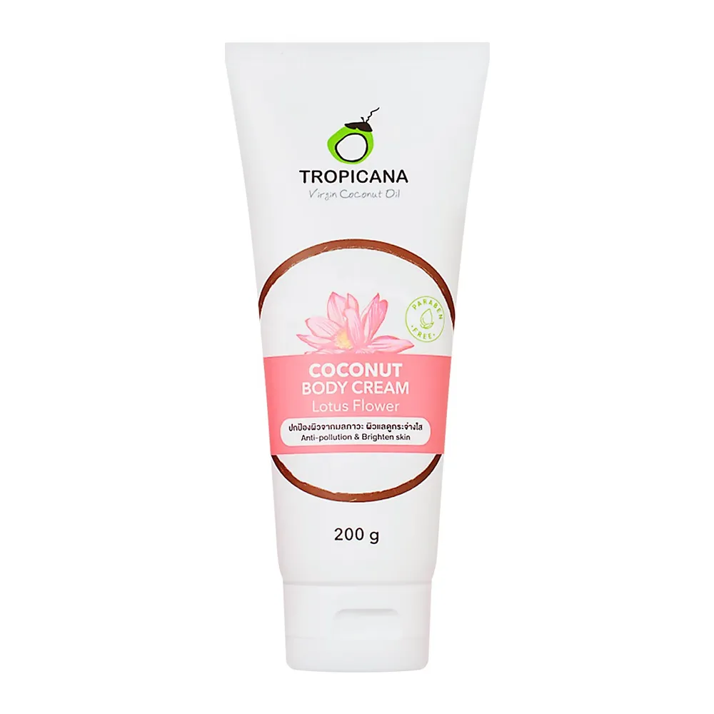 ทรอปิคานา โคโคนัท บอดี้ ครีม โลตัส ฟลาวเวอร์&nbsp;ครีมบำรุงผิวน้ำมันมะพร้าวสูตรผสมสารสกัดดอกบัว&nbsp;ครีมบำรุงผิวกายสูตรเข้มข้นอุดมคุณค่าจากน้ำมันมะพร้าวและสารสกัดจากดอกบัว ผสานคุณค่าของโกโก้บัตเตอร์และน้ำมันเมล็ดอัลมอนด์ ช่วยให้ผิวเนียนนุ่ม แลดูกระจ่างใส ให้ผิวชุ่มชื่นยาวนาน แม้บริเวณจุดสัมผัสแห้งกร้านทั้งข้อศอกและหัวเข่า<br />
