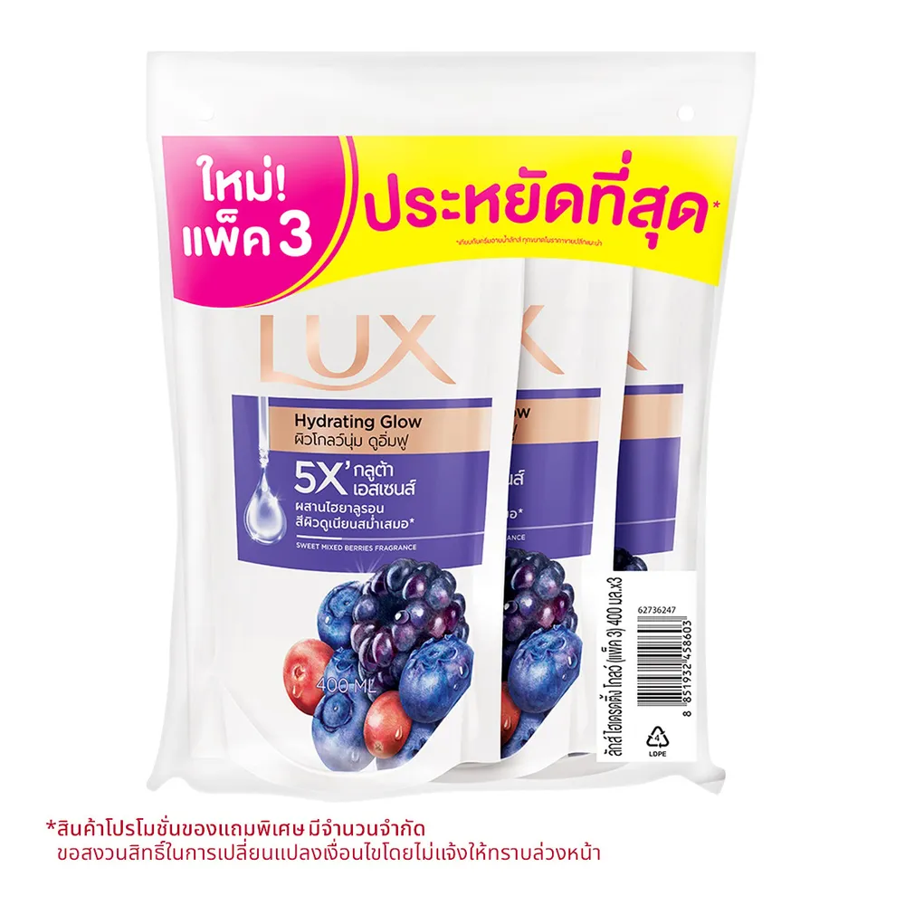 ลักส์ ครีมอาบน้ำ ไฮเดรตติ้ง โกลว์ มิกซ์เบอร์รี่ ถุงเติม 400 มล. แพ็ค 3