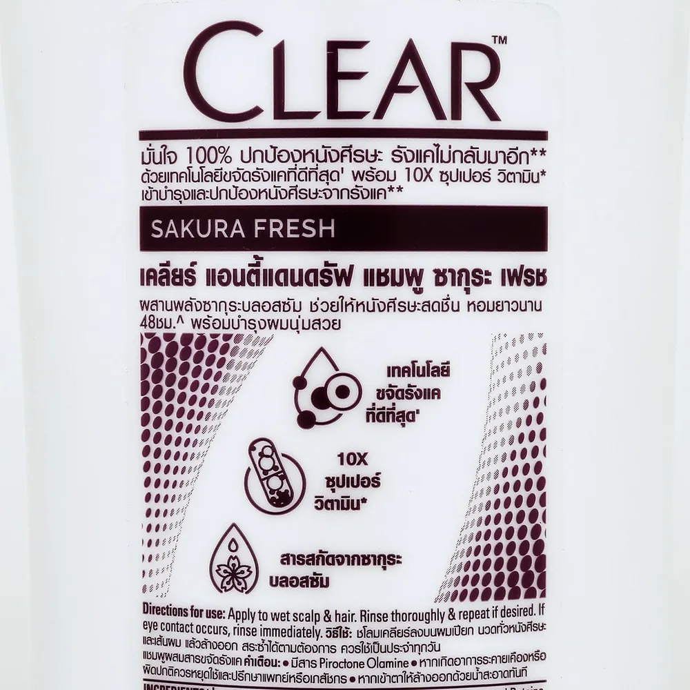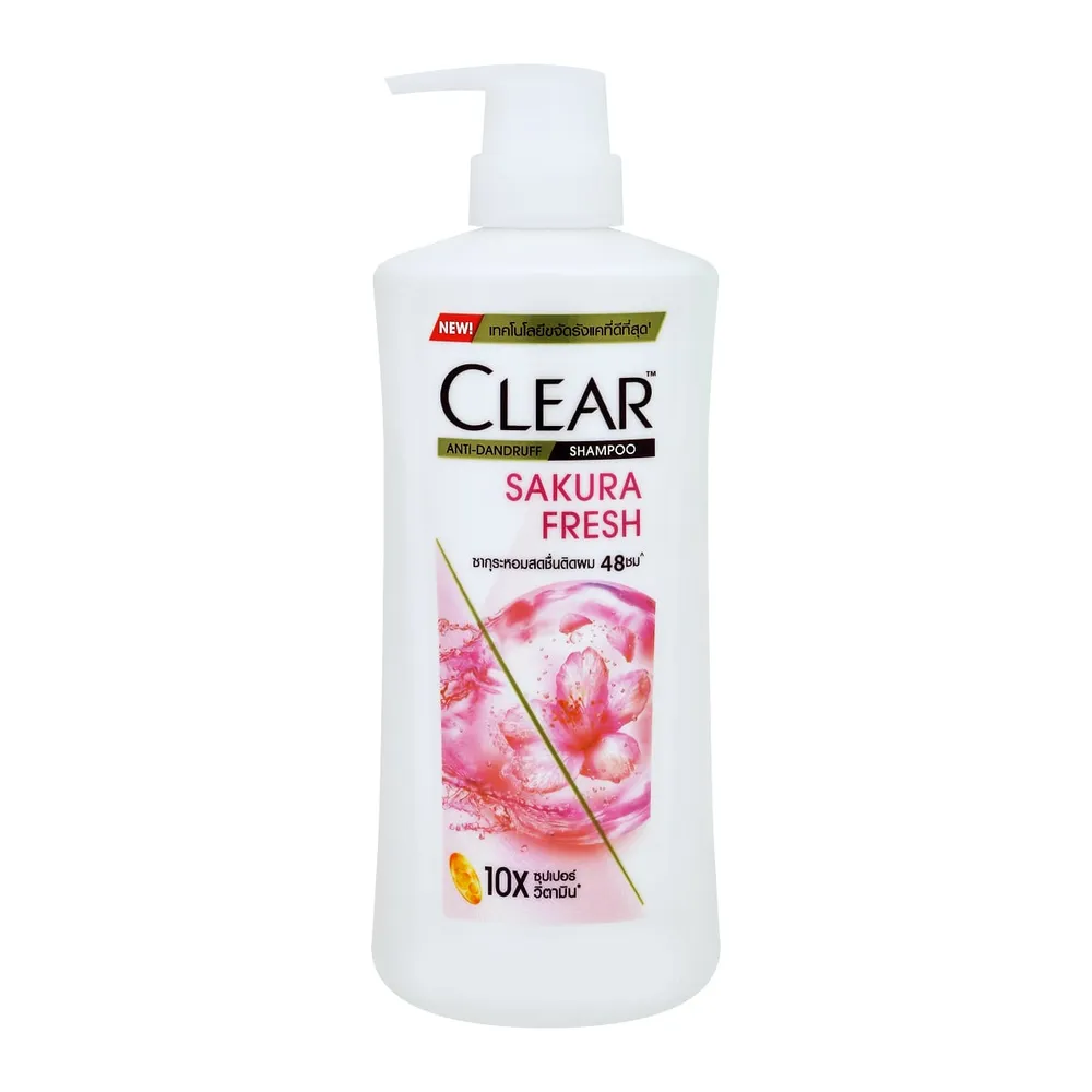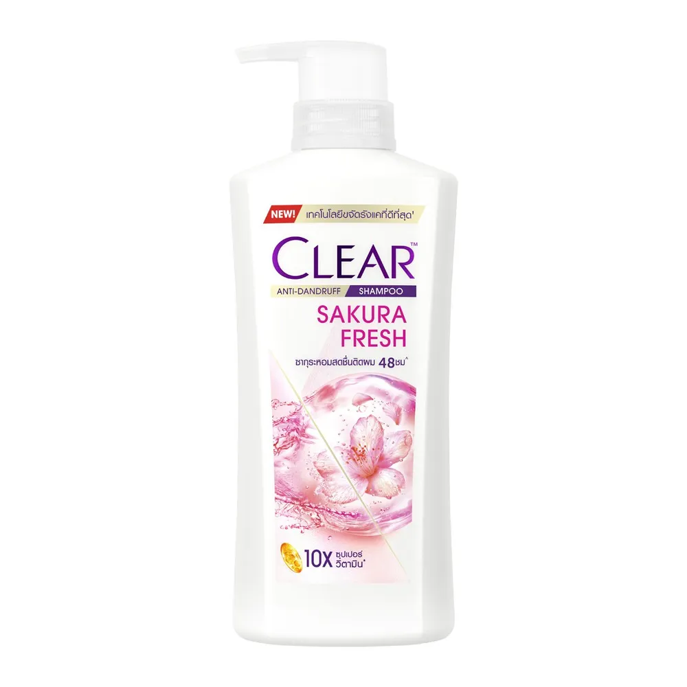 เคลียร์ แชมพูขจัดรังแค สูตรซากุระเฟรช สีชมพู มาพร้อมแอนตี้แดนดรัฟเทคโนโลยี มาพร้อมวิตามินบี 3 และอะมิโนแอสิด เป็นจุดจบของรังแค มั่นใจได้ว่ารังแคจะไม่ย้อนกลับมาอีก พร้อมช่วยให้เส้นผมแข็งแรงจากโคนจรดปลาย ลดอาการขาดร่วงของเส้นผมได้ถึง 10 เท่า พร้อมส่งกลิ่นหอมอย่างยาวนาน<br />