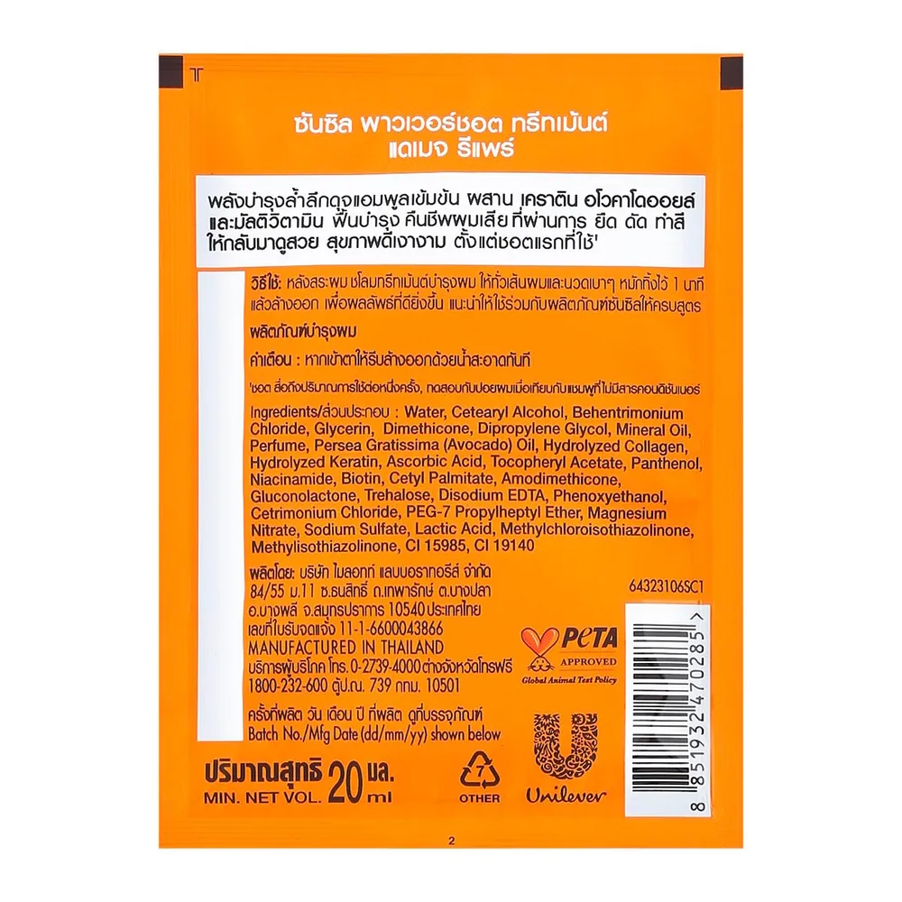 <p>ซันซิล พาวเวอร์ชอต ทรีตเมนต์ แดเมจ รีแพร์<br /><br />ทรีตเมนต์ "ซันซิล" ช่วยเติมความชุ่มชื่น เผยเส้นผมแลดูสดใสมีมนต์เสน่ห์ที่ยั่วยวน สวยเลิศอย่างเป็นธรรมชาติ<br /><br />- ซันซิล ทรีตเมนต์ แดเมจ รีแพร์ สูตรบำรุงผมเสียอย่างล้ำลึก<br />- ทรีตเมนต์สูตรเฉพาะจากซันซิล ที่มาพร้อมแมกซ์ แคลเซียม และเคราติน ช่วยขจัดสิ่งสกปรกและฟื้นบำรุงผมแห้งเสีย<br />- ซึมซาบอย่างล้ำลึกช่วยฟื้นฟูโครงสร้างผม และเติมเต็มเกร็ดผมที่เปราะบาง<br />- ใช้บำรุงผมแห้งเสีย ให้กลับมานุ่มลื่น แข็งแรง และมีสุขภาพดี<br />- บอกลาสัญญาณผมเสียตั้งแต่ครั้งแรกที่ใช้<br /><br />