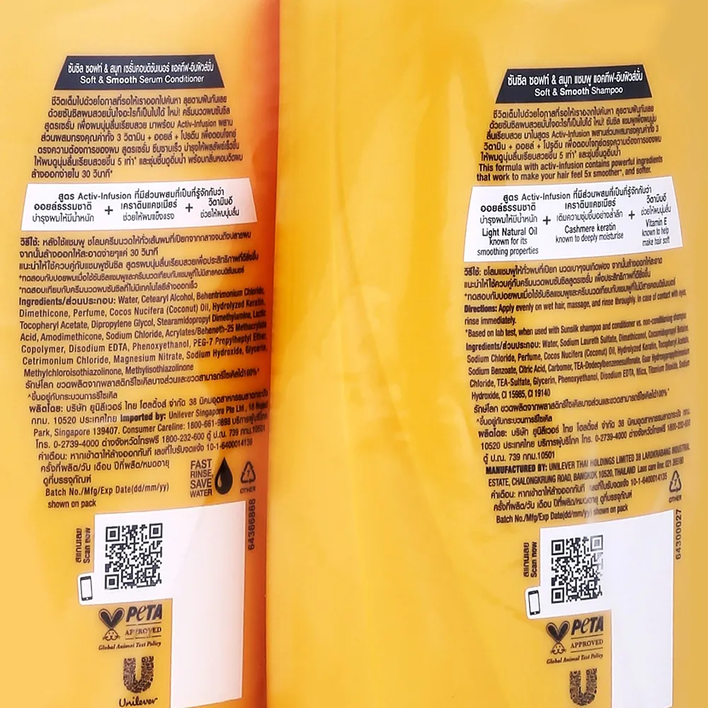 <p>ซันซิล ซอฟท์ แอนด์ สมูท แชมพูสระผมและเซรั่มคอนดิชันเนอร์<br /> <br /> ถึงเวลาสระและบำรุงเส้นผมด้วยแชมพูและเซรั่มคอนดิชันเนอร์ของเราเพื่อผมที่ดูสดใส สวยเลิศอย่างเป็นธรรมชาติ<br /> <br /> - ซันซิล ซอฟท์ &amp; สมูท แชมพูและเซรั่มคอนดิชันเนอร์ แอคทีฟ-อินฟิวส์ชั่น<br /> - ทำความสะอาดสิ่งสกปรกที่เกาะติดอยู่ตามเส้นผมได้อย่างล้ำลึก<br /> - ครีมนวดผมสูตรเซรั่ม ซึมซาบเข้าสู่เส้นผมอย่างรวดเร็ว<br /> - แอคทีฟ-อินฟิวส์ชั่น มีส่วนผสมซึ่งเป็นที่รู้จักกันว่า "ออยล์ธรรมชาติ" ช่วยบำรุงผมให้มีน้ำหนัก<br /> - ผมนุ่มลื่นเรียบสวย<br /> - เคราตินแคชเมียร์ ช่วยให้ผมแข็งแรง<br /> - วิตามิน E ช่วยให้ผมนุ่มลื่น<br /> - ผลลัพธ์ที่ได้ขึ้นอยู่กับสภาพเส้นผมของแต่ละบุคคล<br /><br /><span style="color: #ff0000;">*บริษัทฯ ขอสงวนสิทธิ์ในการปรับเปลี่ยนราคาจำหน่ายและโปรโมชั่น รวมถึงแพ็คเกจและปริมาณสินค้าจากผู้ผลิตได้ตามความเหมาะสม โดยไม่จำเป็นต้องแจ้งให้ทราบล่วงหน้า</span><br /><br />*สีของสินค้าอาจมีความแตกต่าง ขึ้นอยู่กับการตั้งค่าของแต่ละหน้าจอ และภาพประกอบใช้เพื่อการโฆษณาเท่านั้น</p>