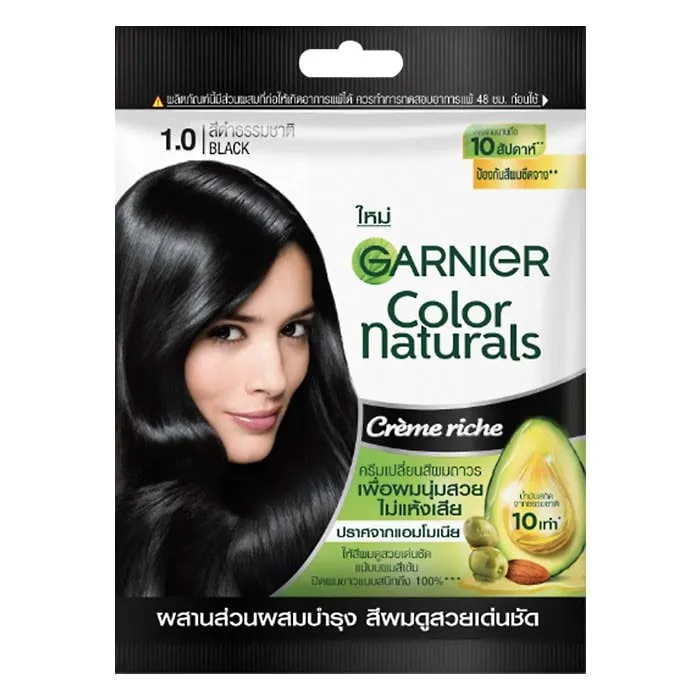 การ์นิเย่ แฮร์ คัลเลอร์แรนท์ สี 1.0 ดำธรรมชาติ ครีมเปลี่ยนสีผมเพื่อสีผมดูสวยเด่นชัด ผสานพลังจากน้ำมันธรรมชาติ 10 เท่า เพื่อผมดูนุ่มสวยไม่แห้งเสีย ปิดผมขาวแนบสนิทถึง 100% สามารถล็อกสีผมให้ติดทนนานได้ถึง 10 สัปดาห์ โดยปราศจากแอมโมเนียและมีกลิ่นหอม<br />