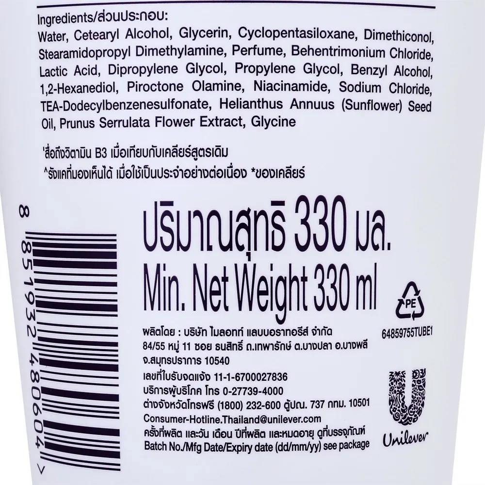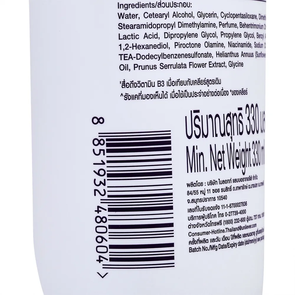 <strong>ส่วนประกอบ:</strong> Water, Cetearyl Alcohol, Glycerin, Cyclopentasiloxane, Dimethiconol, Stearamidopropyl Dimethylamine, Perfume, Behentrimonium Chloride, Lactic Acid, Dipropylene Glycol, Propylene Glycol, Benzyl Alcohol, 1,2-Hexanediol, Piroctone Olamine, Niacinamide, Sodium Chloride, TEA-Dodecylbenzenesulfonate, Helianthus Annuus (Sunflower) Seed Oil, Prunus Serrulata Flower Extract, Glycine<br />