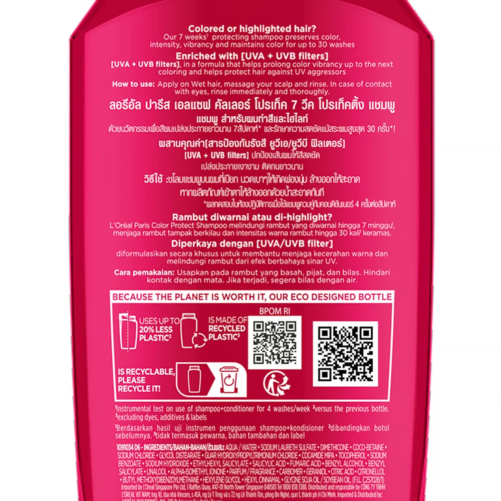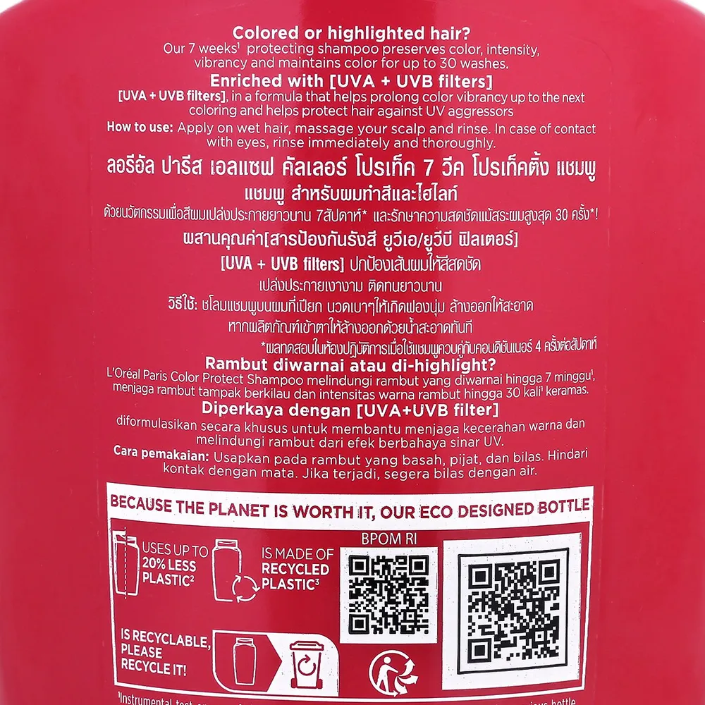 ลอรีอัล ปารีส เอลแซฟ คัลเลอร์ โปรเท็ค 7 วีค โปรเท็คติ้ง แชมพูผสมสารป้องกันแสงแดด สำหรับผมทำสีและไฮไลท์ ผสาน ยูวีเอ และ ยูวีบี ฟิลเตอร์ ปกป้องเส้นผมให้สีผมสวยเปล่งประกายยาวนาน 7 สัปดาห์<br />