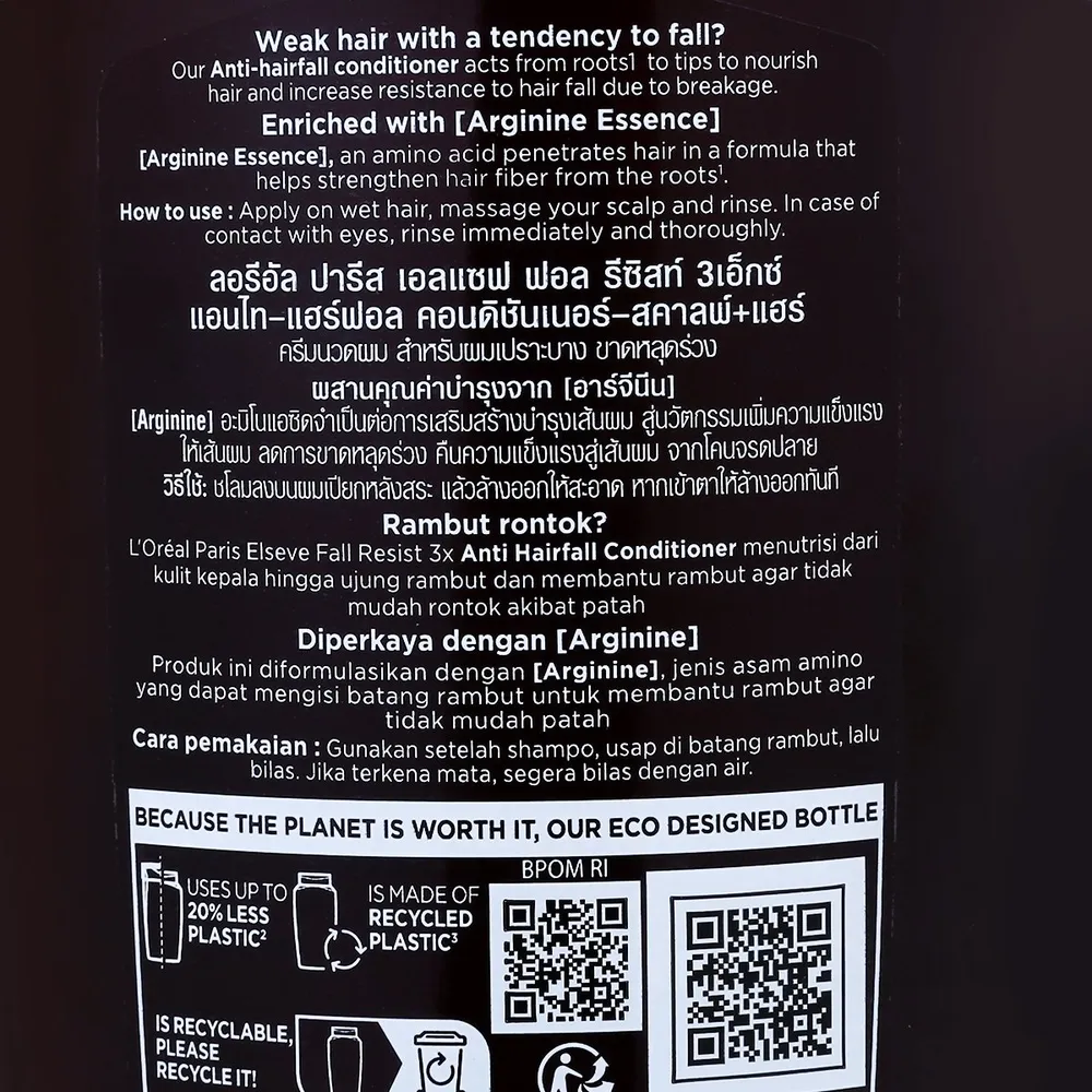 ลอรีอัล ปารีส เอลแซฟ ฟอล รีซิสท์ แอนไท-แฮร์ฟอล คอนดิชันเนอร์ สคาลพ์+แฮร์ ครีมนวดผมสูตรสำหรับลดผมขาดหลุดร่วง ด้วยคุณค่าจากอาร์จินีน อะมิโนแอซิดที่จำเป็นต่อการเสริมสร้างบำรุงเส้นผม สู่นวัตกรรมจาก ฟอล รีซิสท์ 3X นวัตกรรมล่าสุดจาก ลอรีอัล ปารีส<br />