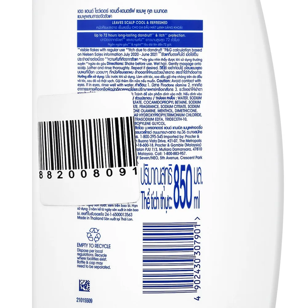 เฮดแอนด์โชว์เดอร์ แชมพูขจัดรังแค สูตรคูลเมนทอล 850 มล.