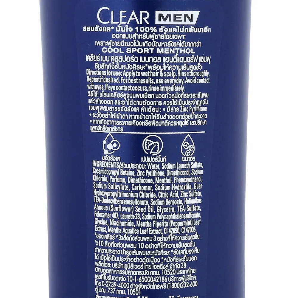 เคลียร์ เมน แชมพู แอนตี้แดนดรัฟ แชมพู คูลสปอร์ต เมนทอล แชมพูขจัดรังแคที่ออกแบบสำหรับผู้ชายโดยเฉพาะ เพราะผู้ชายมีแนวโน้มเกิดปัญหารังแคได้มากกว่า ช่วยสร้างความสดชื่นให้หนังศีรษะและเส้นผมเพื่อความรู้สึกเย็นสุดขีด มีทริปเปิล แอนตี้ แดนดรัฟ เทคโนโลยี พร้อมวิตามินบี 3 และทอรีน ช่วยขจัดรังแค พร้อมสัมผัสพลังความเย็นทันทีที่ใช้ สดชื่นยาวนานตลอดวัน<br />