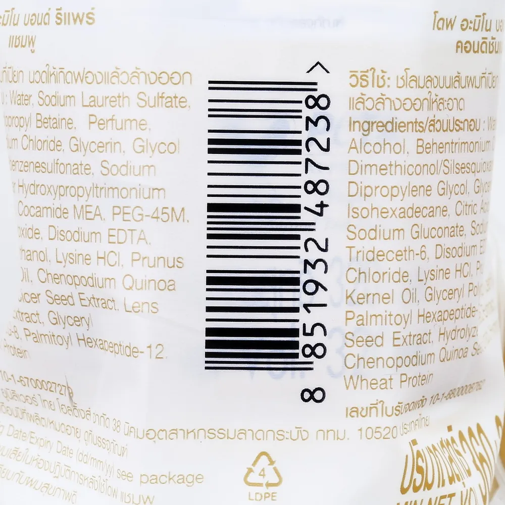 ใหม่! โดฟ อะมิโน บอนด์ รีแพร์ แชมพู + คอนดิชันเนอร์ พร้อมอะมิโนคอมเพล็กซ์* ที่ได้รับการยอมรับว่าช่วยเสริมสร้างโปรตีนในเส้นผม โดฟ อะมิโน บอนด์ รีแพร์ สามารถเชื่อมพันธะแกนผมระดับโมเลกุล ฟื้นบำรุง 90% ของผมที่ถูกทำลาย&#39; กู้ผมเสียขั้นวิกฤติให้กลับมานุ่มสวย มีน้ำหนักจัดทรงง่าย พร้อมทุกการจัดแต่งทรง สำหรับผมเสียมาก<br />