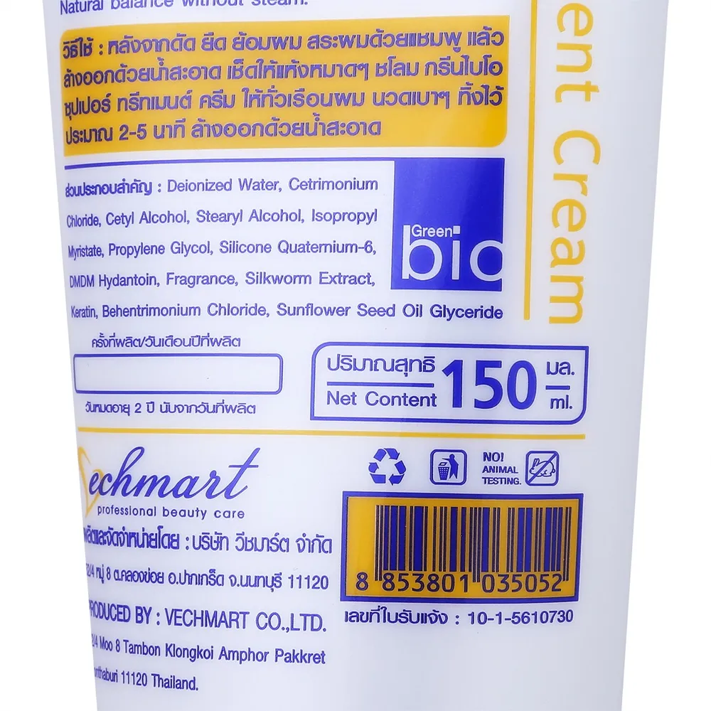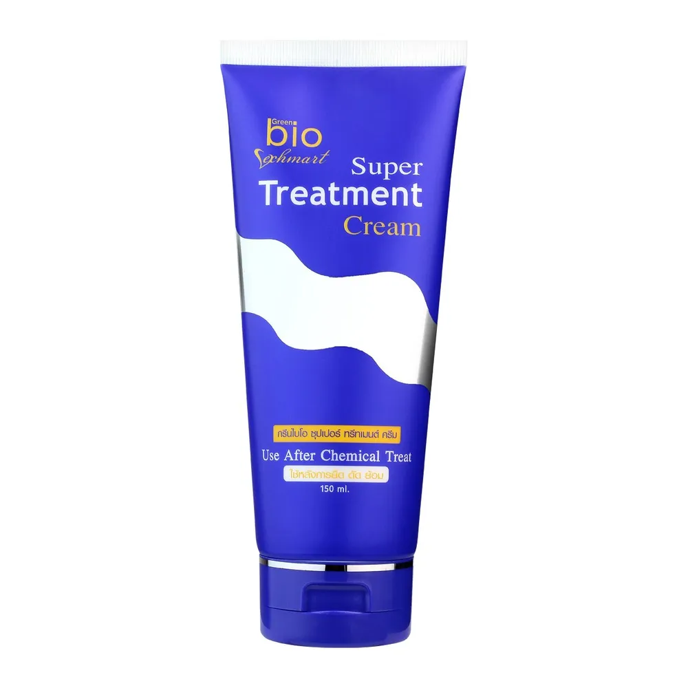 กรีนไบโอ ซุปเปอร์ ทรีทเมนต์ ครีม&nbsp;ทรีทเมนต์สำหรับผมที่ผสานคุณค่าเคราติน สารสกัดไหม และน้ำมันดอกทานตะวัน สามารถซึมลึกเข้าสู่เส้นผม ปรับสภาพเส้นผมหลังจากการยืด ดัด ย้อม ฟื้นฟูผมที่แห้งเสียให้มีน้ำหนัก ปกป้องเส้นผมจากความร้อนและสารเคมี ให้ผมสวยเป็นธรรมชาติราวกับทำสปาผม โดยไม่ต้องอบไอน้ำ<br />