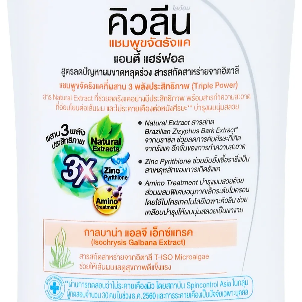 คิวลีนแชมพูขจัดรังแค สูตรลดปัญหาผมขาดหลุดร่วง จากสารสกัดจากสาหร่ายจากอิตาลีกาลบาน่า และเปลือกไม้ของต้นซิซิฟัสจากบราซิล ตัวช่วยดีๆ ในการลดอาการคัน ขจัดรังแคอย่างมีประสิทธิภาพ พร้อมบำรุงผมนุ่มผมของคุณให้สุขภาพดี<br />