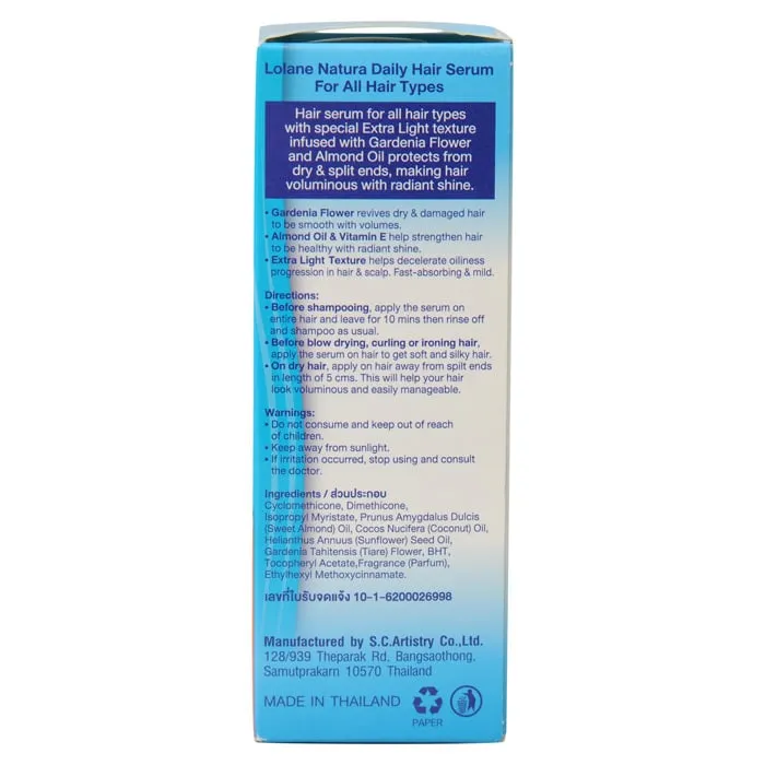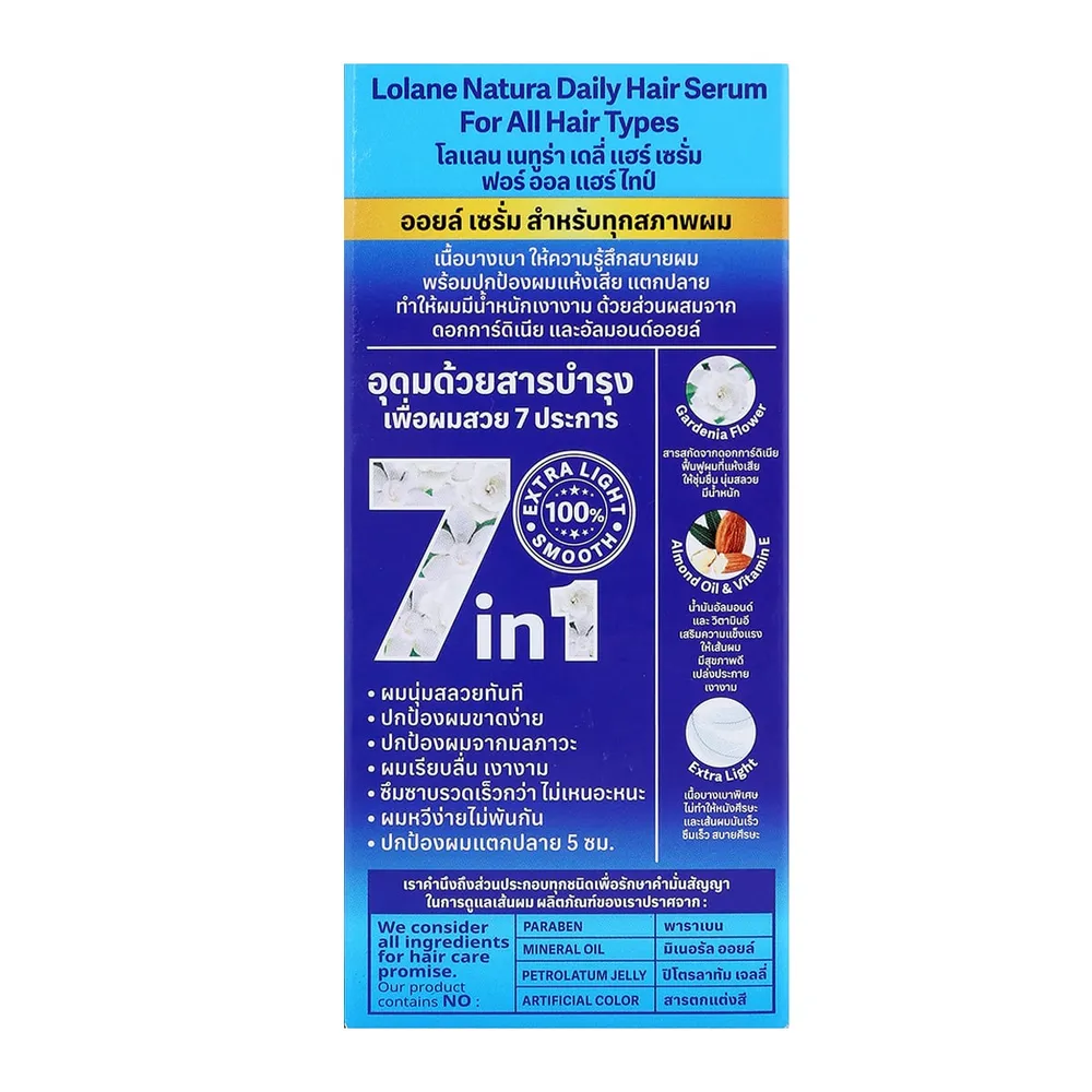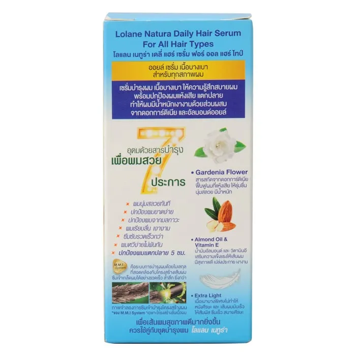 โลแลน เนทูร่า เดลี่ แฮร์ เซรั่ม ออย์ เซรั่มเนื้อบางเบา สำหรับทุกสภาพผม เซรั่มบำรุงผม เนื้อบางเบา ให้ความรู้สึกสบายผม พร้อมปกป้องผมแห้งเสีย แตกปลาย ทำให้ผมมีน้ำหนักเงางาม ผมนุ่มสลวย ด้วยส่วนผสมจากดอกการ์ดิเนีย และอัลมอนด์ออยล์<br />