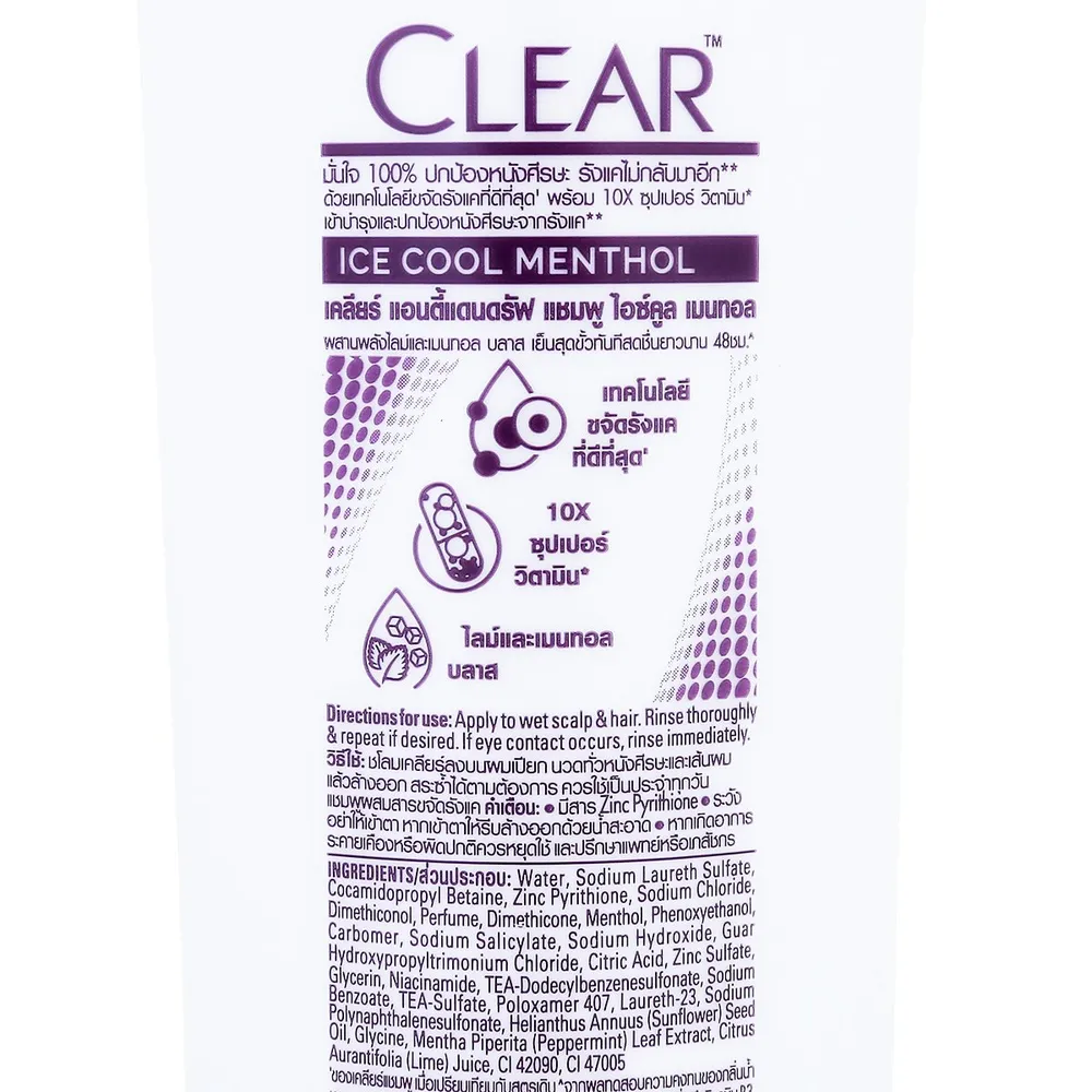 เคลียร์ ไอซ์คูล เมนทอล แอนตี้แดนดรัฟ สกาล์ป แคร์ แชมพู ที่มาพร้อมส่วนผสมจากไลม์และเมนทอลที่ช่วยขจัดรังแค ทำความสะอาดหนังศีรษะอย่างล้ำลึกเพื่อกำจัดความมัน อีกทั้งยังให้ความเย็นสดชื่นยาวนานเพื่อช่วยบรรเทาอาการคันบนหนังศีรษะอย่างได้ผล<br />