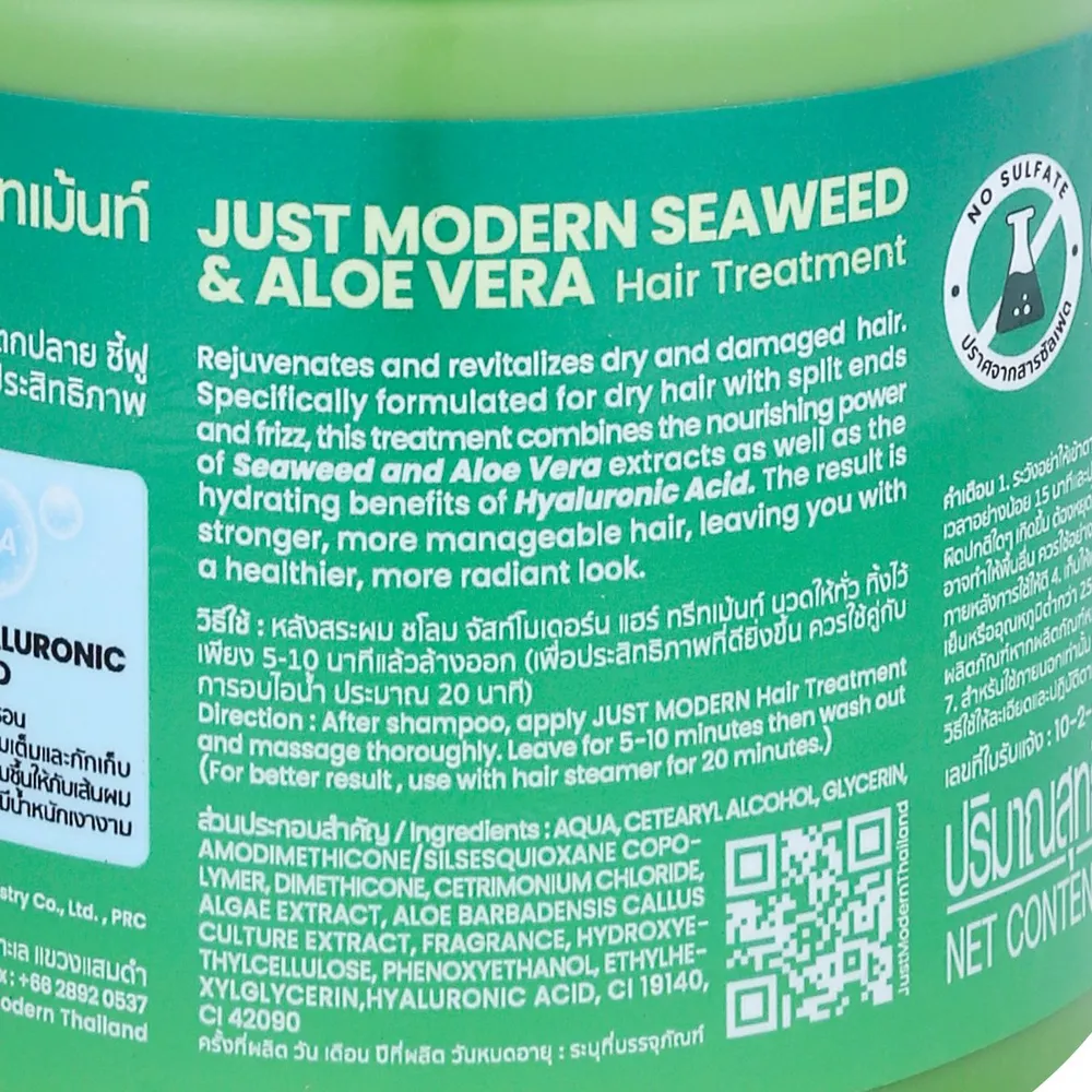จัสท์โมเดิร์น ครีมหมักผม สูตรสาหร่ายทะเลลึก ผสานการบำรุงของสาหร่ายและโปรวิตามิน บี 5 เพื่อฟื้นบำรุงสุขภาพผมที่แห้งเสียแตกปลาย ขาดน้ำหนัก ช่วยฟื้นบำรุงเส้นผมของคุณให้กลับมาแข็งแรงและสุขภาพดีนุ่มลื่นสวย<br />