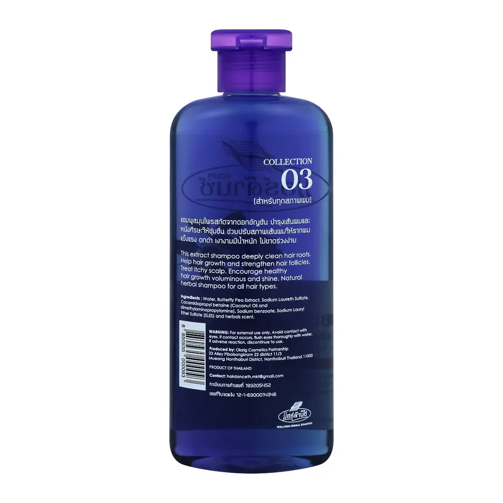 ช่วยดูแลและบำรุงให้เส้นผมและหนังศีรษะแข็งแรง อ่อนโยนสุดๆ เพราะเป็นสูตรจากสมุนไพรธรรมชาติดอกอัญชัญ ลดการอักเสบบนหนังศีรษะ เสริมสร้างรากผมที่ขึ้นใหม่ให้สมบูรณ์แข็งแรงผมดกดำเป็าเงางาม<br />