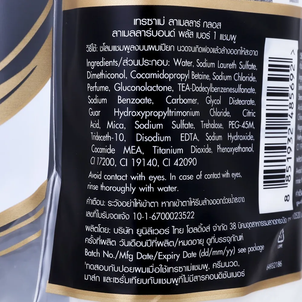 เทรซาเม่ ลาเมลลาร์ กลอส ลาเมลลาร์บอนด์ พลัส เบอร์ 1 แชมพู ผสานด้วย ไมโครชีท ลาเมลลาร์ เทคโนโลยีเอกสิทธิ์เฉพาะจากเทรซาเม่ ช่วยบำรุงล้ำลึกถึกถึงพันธะแกนผมจากภายใบสู่กายนอก คืนชีพผมที่แห้งกร้าน แข็งกระด้าง กลับมานุ่มลื่น เงางามถึง 8 เท่า+ ให้ผมเรียงตัวสวย เล่นแสง เป๊ะปังราวกับเข้าซาลอน<br />