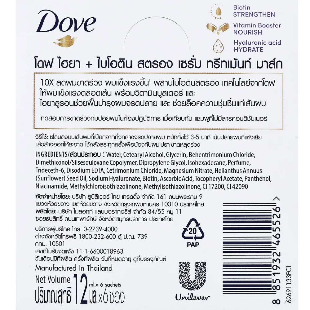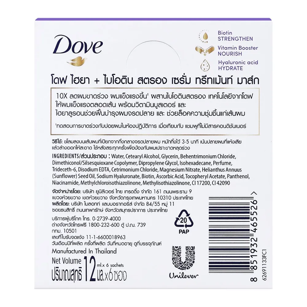<p>โดฟ ทรีทเม้นท์ ไฮยา ไบโอติน สตรอง 12 มล. x 6 ซอง<br />
