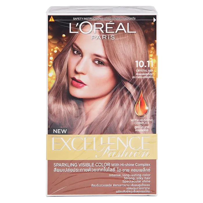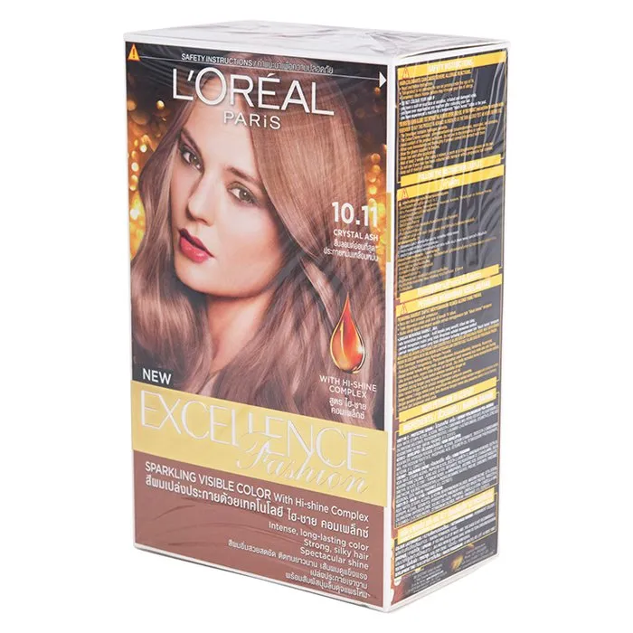 ลอรีอัล ปารีส เอกซ์เซลเล้นซ์ แฟชั่น ครีมเปลี่ยนสีผม สี 10.11 สีบลอนด์อ่อนที่สุด ประกายหม่นเหลือบหม่น ให้สีผมสวยเปล่งประกายด้วยเทคโนโลยีไฮ-ชายน์ คอมเพล็กซ์ สีผมอิ่มสวยสดชัด ติดทนยาวนาน ให้เส้นผมดูแข็งแรง เปล่งประกายเงางาม พร้อมสัมผัสนุ่มลื่นดุจแพรไหม<br />