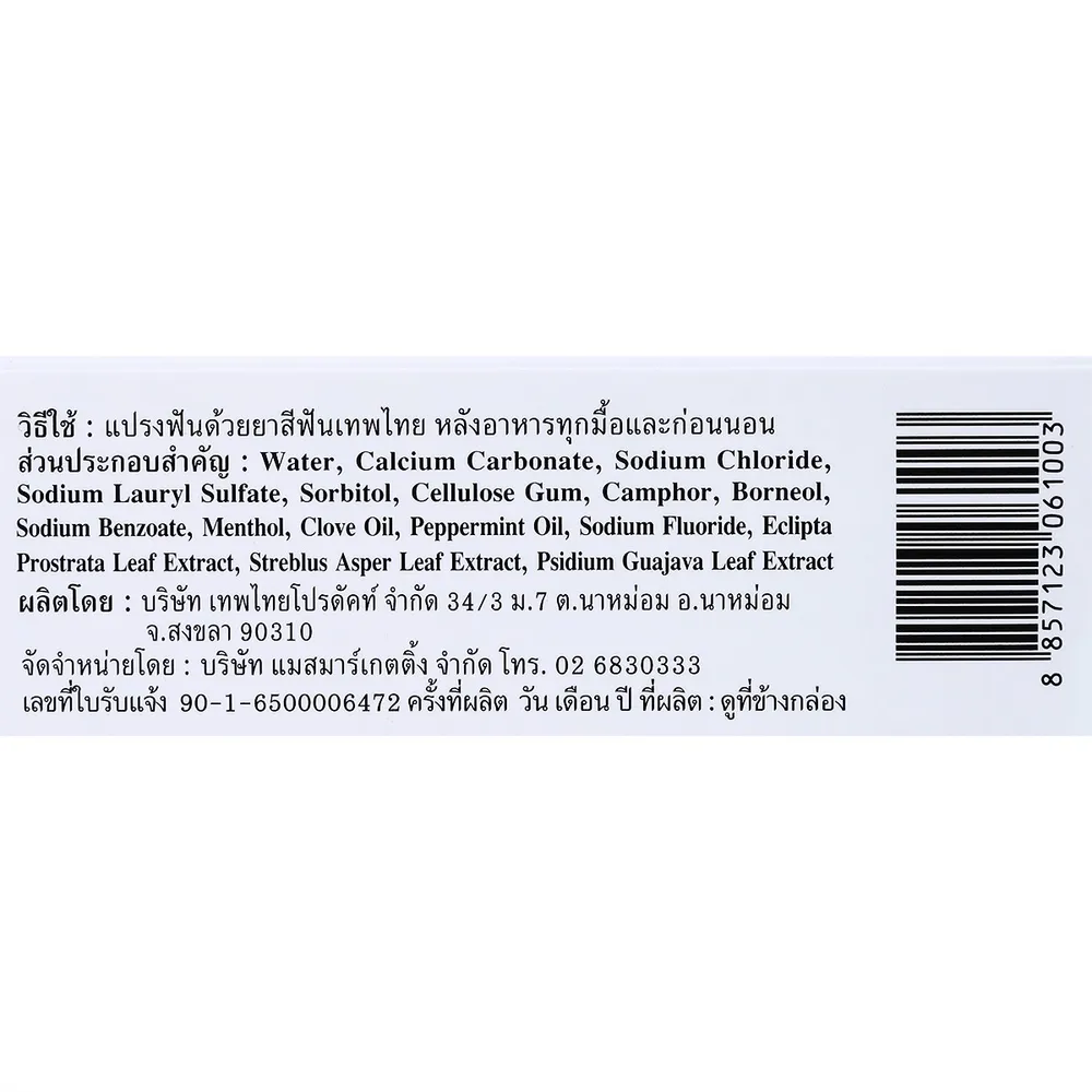 เทพไทย ยาสีฟันสมุนไพรสูตรเข้มข้นที่ประกอบด้วยพิมเสน การบูร ข่อย กานพลู และสะระแหน่ ซึ่งมีคุณสมบัติในการดูแลปัญหาสุขภาพเหงือก ฟันผุ และลดคราบหินปูน ชา กาแฟ บุหรี่ ช่วยลดกลิ่นปาก ทำให้ปากสะอาด ลมหายใจหอมสดชื่น<br />