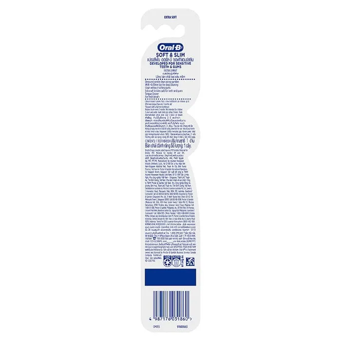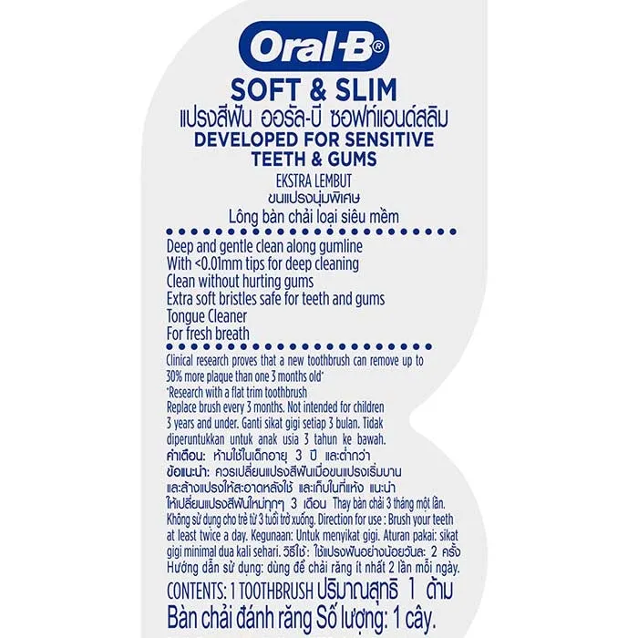 ออรัลบี แปรงสีฟัน รุ่นซอฟท์แอนด์สลิม ขนแปรงนุ่มพิเศษ ขนแปรงเรียว &lt;0.01 มม. ออกแบบมาเพื่อความสะอาดอย่างล้ำลึก มาพร้อมที่แปรงลิ้นด้านหลัง ช่วยให้การทำความสะอาดช่องปากดีขึ้น<br />