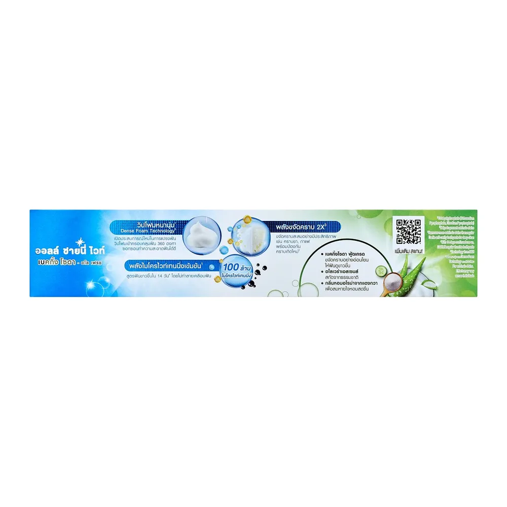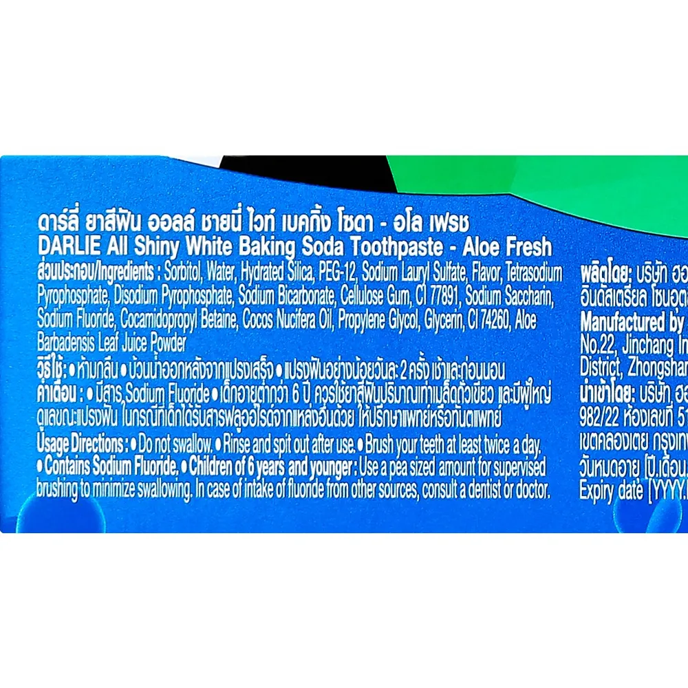 ดูแลช่องปากของคุณด้วย ดาร์ลี่ ยาสีฟัน ออลล์ ชายนี่ ไวท์ เบคกิ้ง โซดา - อโล เฟรช ที่ผสานเบคกิ้งโซดาฟู้ดเกรด ช่วยขจัดคราบอย่างอ่อนโยนแต่มีประสิทธิภาพ พร้อม 1,000 ล้าน ไมโครไวท์เทนนิ่ง เพื่อฟันขาวใน 14 วัน&nbsp;โดยไม่ทำลายเคลือบฟัน<br />