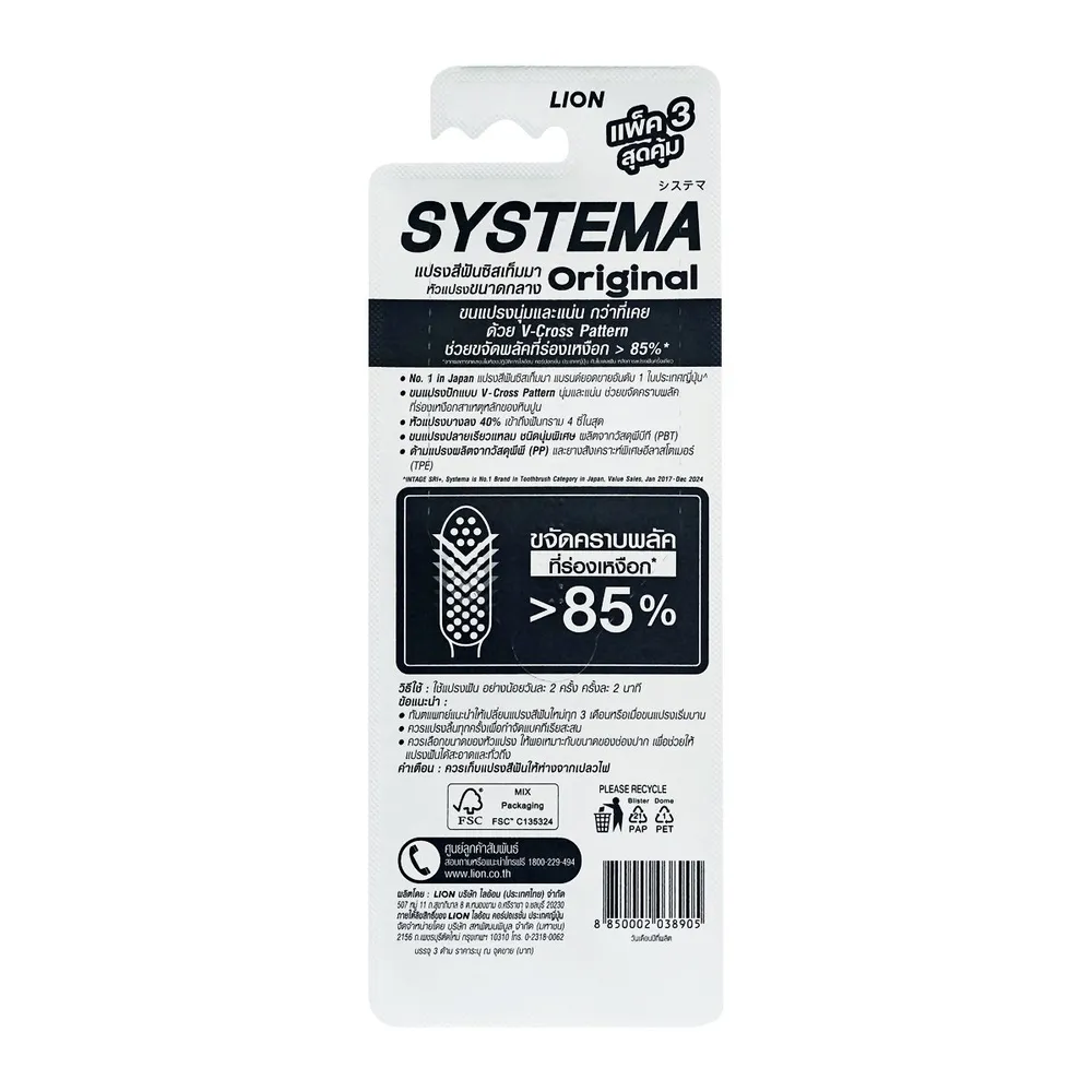 - ขนแปรงปลายเรียวแหลม V-Cross ช่วยขจัดคราบพลัคที่ร่องเหงือก &gt;85% *จากผลการทดสอบในห้องปฏิบัติการไลอ้อน คอร์ปอเรชั่น ประเทศญี่ปุ่น กับโมเดลฟันหลังการแปรงฟันครั้งเดียว<br />
