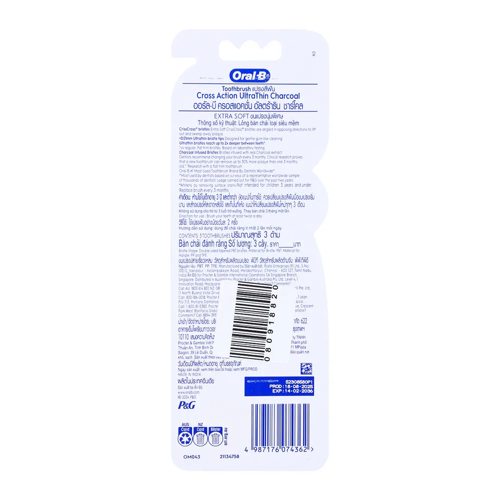 ออรัล-บี แปรงสีฟัน ครอส แอคชั่น อัลตร้าธิน ชาร์โคล แพ็ค 3 (สินค้าคละสี ไม่สามารถเลือกได้)