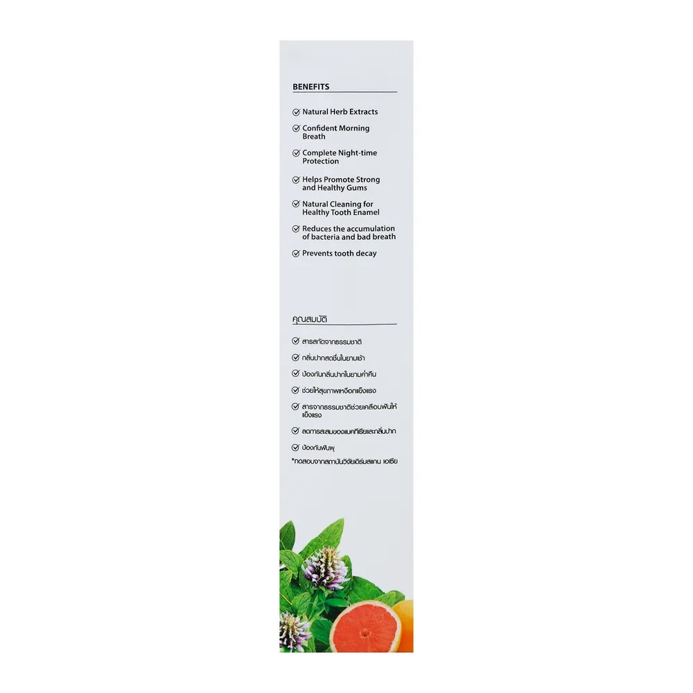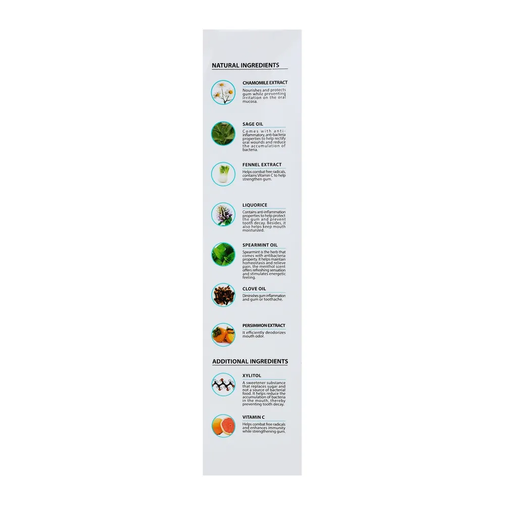 - ผสานพลังจากสมุนไพรธรรมชาติ 6 ชนิด ได้แก่ คาโมไมล์, เสจ, ผักชีล้อม, ชะเอมเทศ, น้ำมันหอมระเหยเปปเปอร์มิ้นท์ และกานพูล<br />