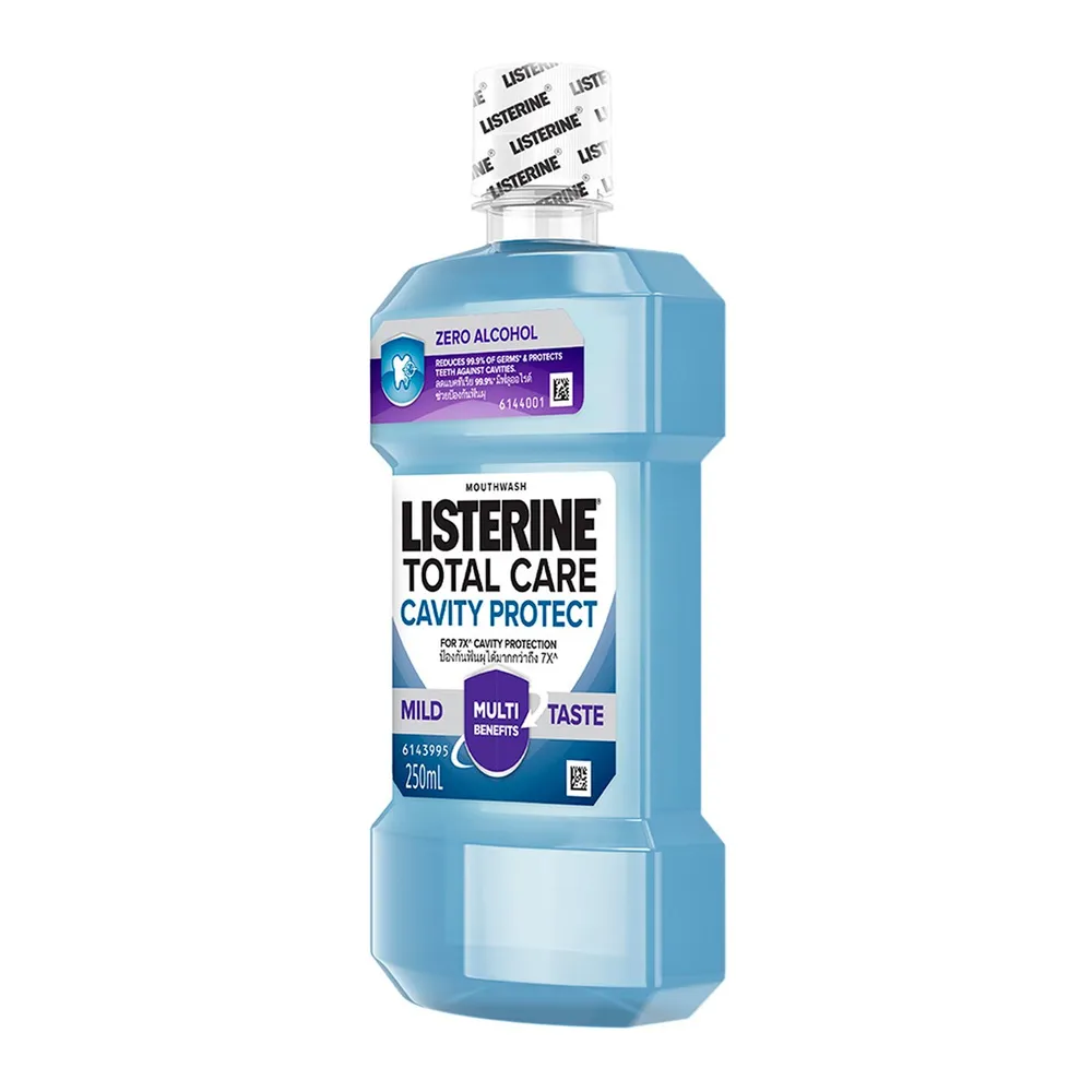 ลิสเตอรีน โทเทิลแคร์ แควิตี้ โพรเทค น้ำยาบ้วนปากรสชาติอ่อนโยน 0% แอลกอฮอล์ มีส่วนผสมของฟลูออไรด์ พร้อมน้ำมันสกัดจากธรรมชาติ 4 ชนิด ได้แก่ เมนทอล ไทมอล เมธิลซาลิไซเลท ยูคาลิปตอล<br />